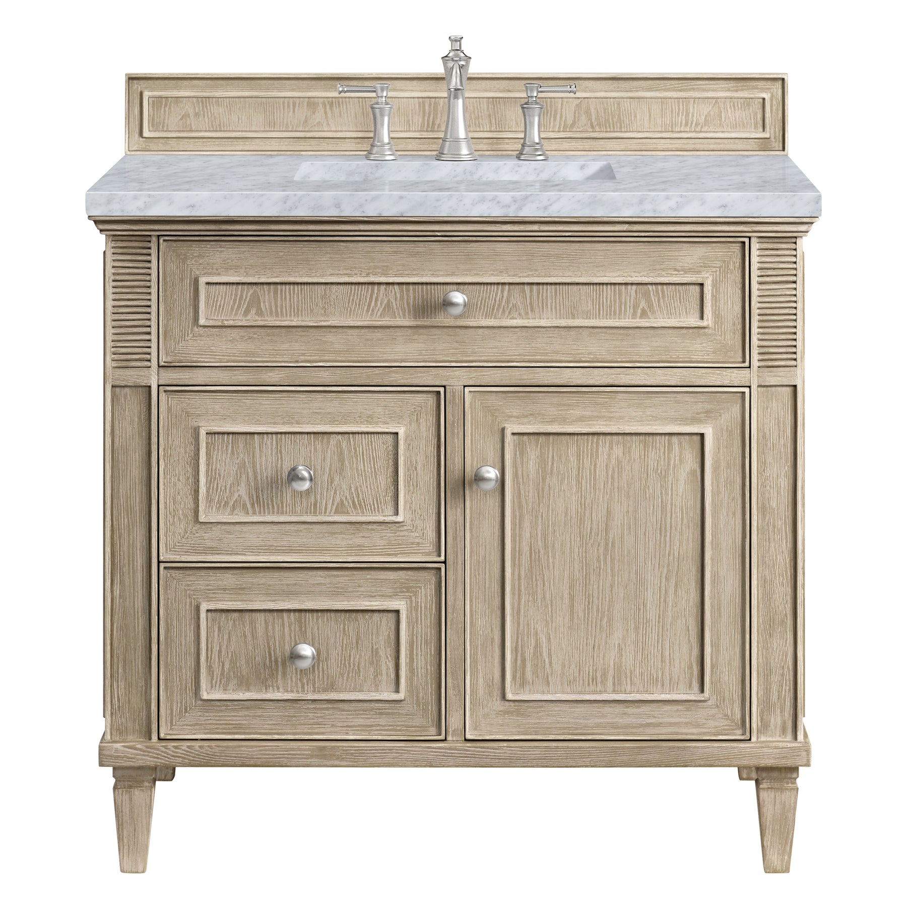 The 36" Lorelai Single Vanity celebrates timeless form and exquisite finish details, combined with practical function. The Whitewashed Oak finish is accented by reeded details, and clean, raised picture frame molding. Coin-edge knobs in Satin Nickel provide the perfect accent. This single-door cabinet opens to a spacious interior with a single shelf and a convenient USB/Electric power outlet. Two drawers and an upper tip-out drawer offer additional storage space. Completing this vanity, are the treasured, neutral tones and textures of the Carrara marble vanity top display a white background with delicate grey veining.