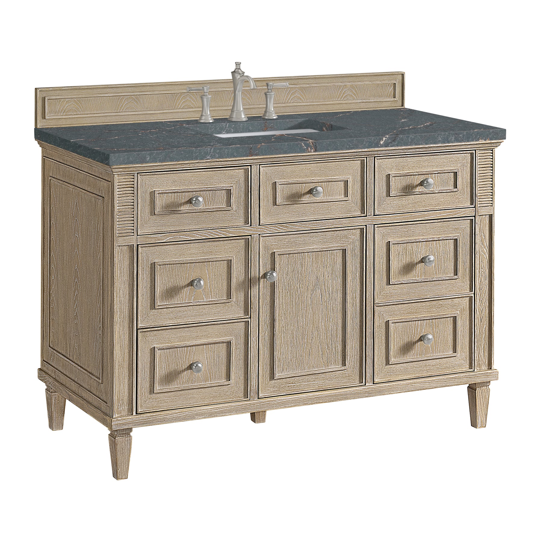 The 48" Lorelai Single Vanity celebrates timeless form and exquisite finish details, combined with practical function. The Whitewashed Oak finish is accented by reeded details, and clean, raised picture frame molding. Coin-edge knobs in Satin Nickel provide the perfect accent. This single-door cabinet opens to a spacious interior with a single shelf and a convenient USB/Electric power outlet. Six drawers plus one tip-out drawer offer additional storage space. The finish and hardware accents are enhanced by the Parisien Blue Silestone top, offering a deep bluish hue with broad and intricate neutral veins highlighted by fine coppery accents.