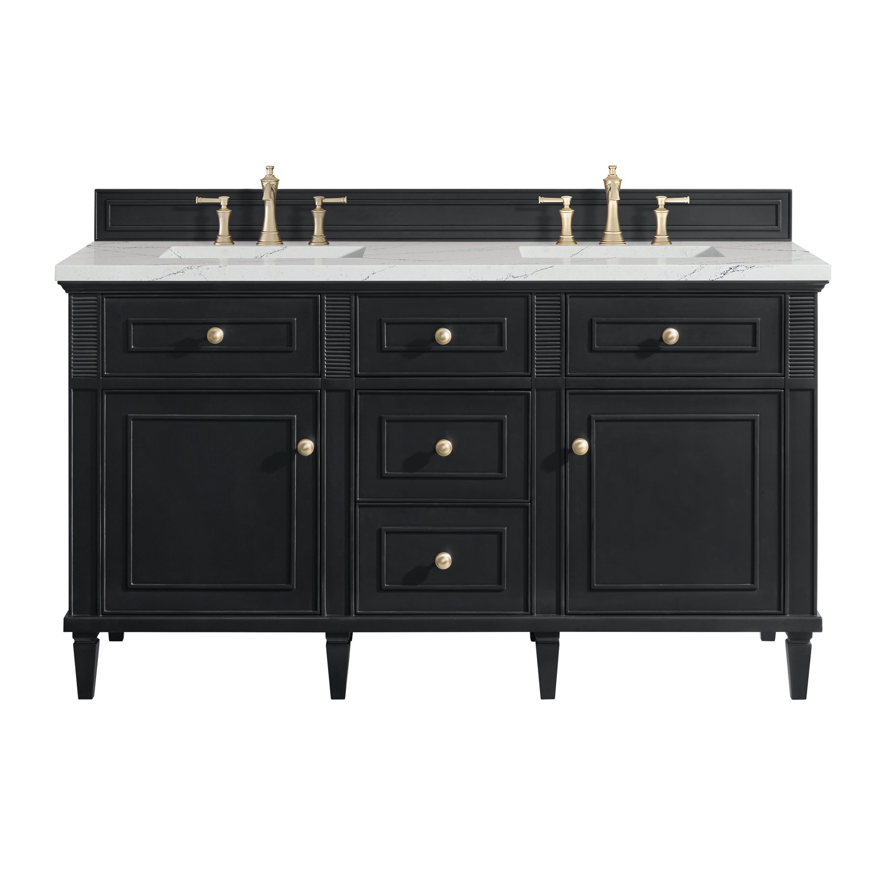 The 60" Lorelai Double Vanity celebrates timeless form and exquisite finish details, combined with practical function. The rich Black Onyx finish is accented by coin-edge knobs in Champagne Brass which provides an sophisticated contrast. Reeded details, and clean, and raised picture frame molding lend visual interest. This two-door cabinet opens to a spacious interior with shelves and convenient USB/Electric power outlets. Three traditional drawers and two tip-outs offer additional storage space. The addition of a Ethereal Noctis Silestone top by Cosentino with undermount rectangular sink completes this timeless bathroom centerpiece with its modern, intricate black and gray nuances which add contrast and elegance to the white background.