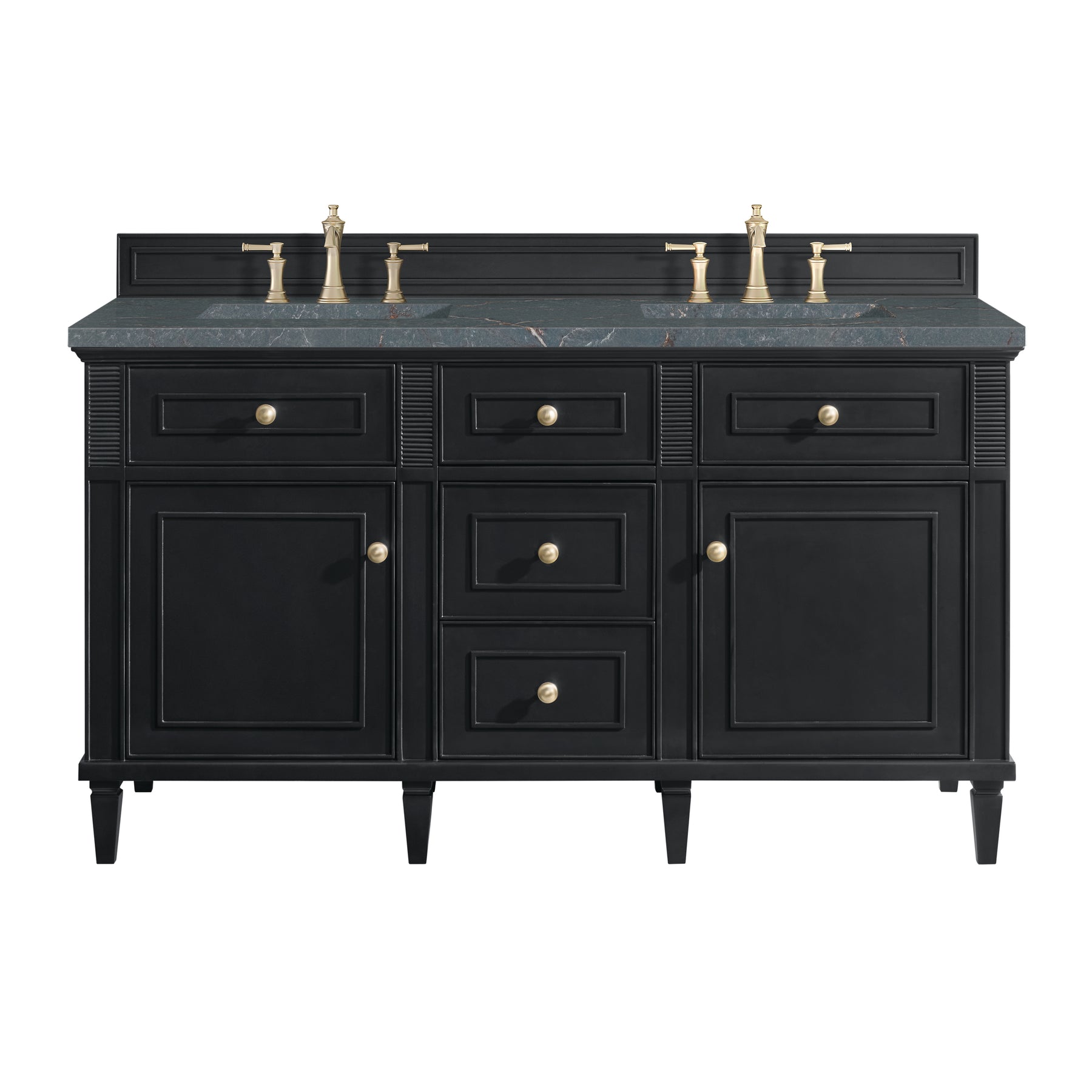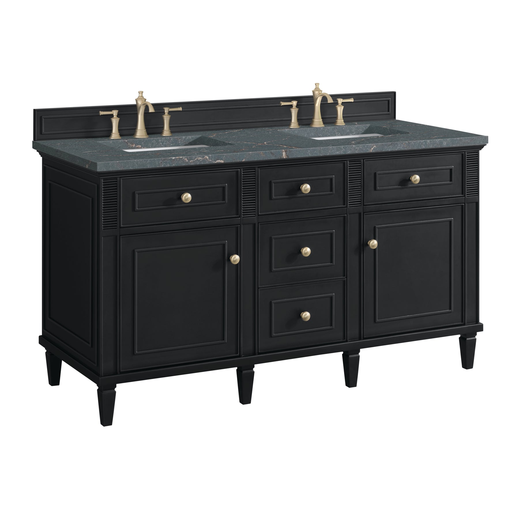 The Lorelai 60" Double Vanity by James Martin Vanities celebrates timeless design and exquisite finish details, combined with practical function. The rich Black Onyx finish is accented by coin-edge knobs in Champagne Brass which provides a sophisticated contrast. Reeded details and raised picture frame molding lend visual interest. The two-door cabinet opens to reveal a spacious interior with single shelves and a convenient USB/120V power outlet behind each door. Three standard full-extension drawers and two top-row tip-out drawers offer additional storage. The addition of a gorgeous Parisien Bleu Silestone top with undermount sink completes the look.
