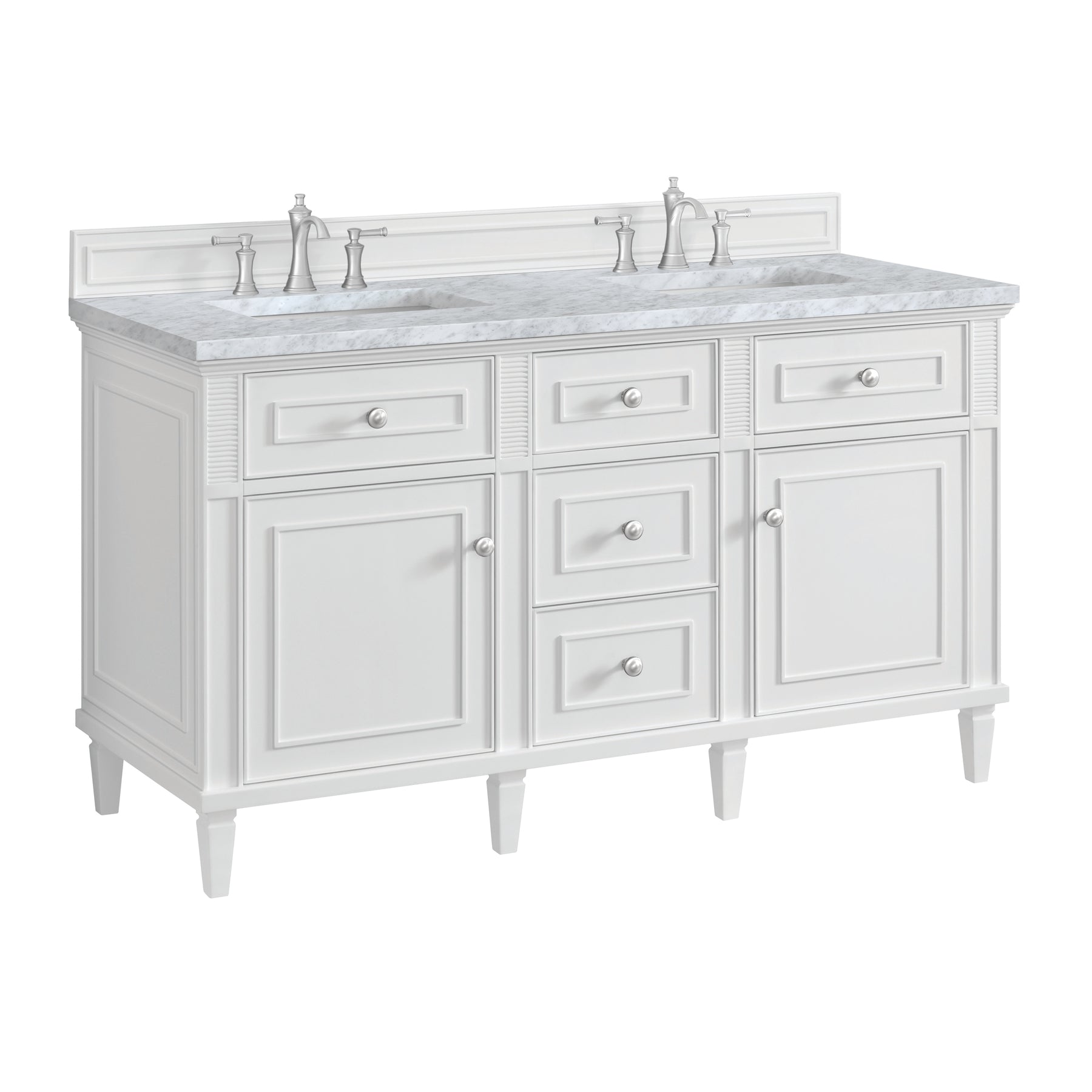 The 60" Lorelai Double Vanity celebrates timeless form and exquisite finish details, combined with practical function. The sophisticated Bright White finish is accented by reeded details, and clean, raised picture frame molding. Coin-edge knobs in Satin Nickel provide the perfect accent. This two-door cabinet opens to a spacious interior with shelves and convenient USB/Electric power outlets. Three traditional drawers and two tip-outs offer additional storage space. Completing this vanity, are the treasured, neutral tones and textures of the Carrara marble vanity top display a white background with delicate grey veining.