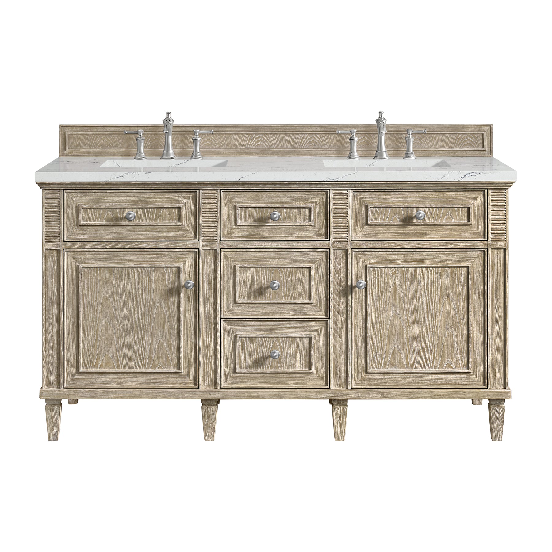The 60" Lorelai Double Vanity celebrates timeless form and exquisite finish details, combined with practical function. The Whitewashed Oak finish is accented by reeded details, and clean, raised picture frame molding. Coin-edge knobs in Satin Nickel provide the perfect accent. This two-door cabinet opens to a spacious interior with shelves and convenient USB/Electric power outlets. Three traditional drawers and two tip-outs offer additional storage space. The addition of a Ethereal Noctis Silestone top by Cosentino with undermount rectangular sink completes this timeless bathroom centerpiece with its modern, intricate black and gray nuances which add contrast and elegance to the white background.