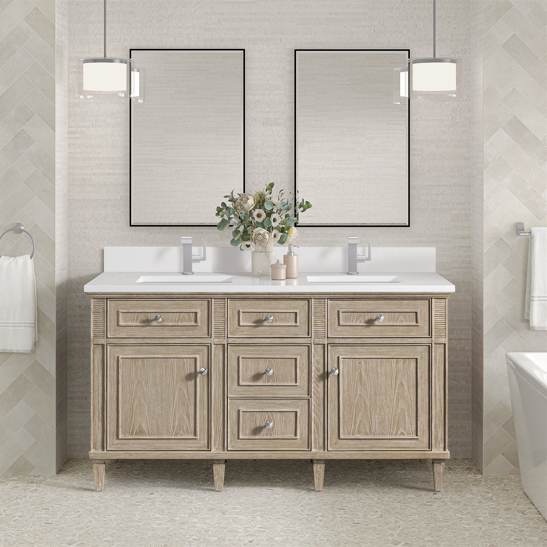 The 60" Lorelai Double Vanity celebrates timeless form and exquisite finish details, combined with practical function. The Whitewashed Oak finish is accented by reeded details, and clean, raised picture frame molding. Coin-edge knobs in Satin Nickel provide the perfect accent. This two-door cabinet opens to a spacious interior with shelves and convenient USB/Electric power outlets. Three traditional drawers and two tip-outs offer additional storage space. With the addition of a classic White Zeus Silestone top with backsplash and undermount sink, this vanity is a seamless integration of modern design and functionality.