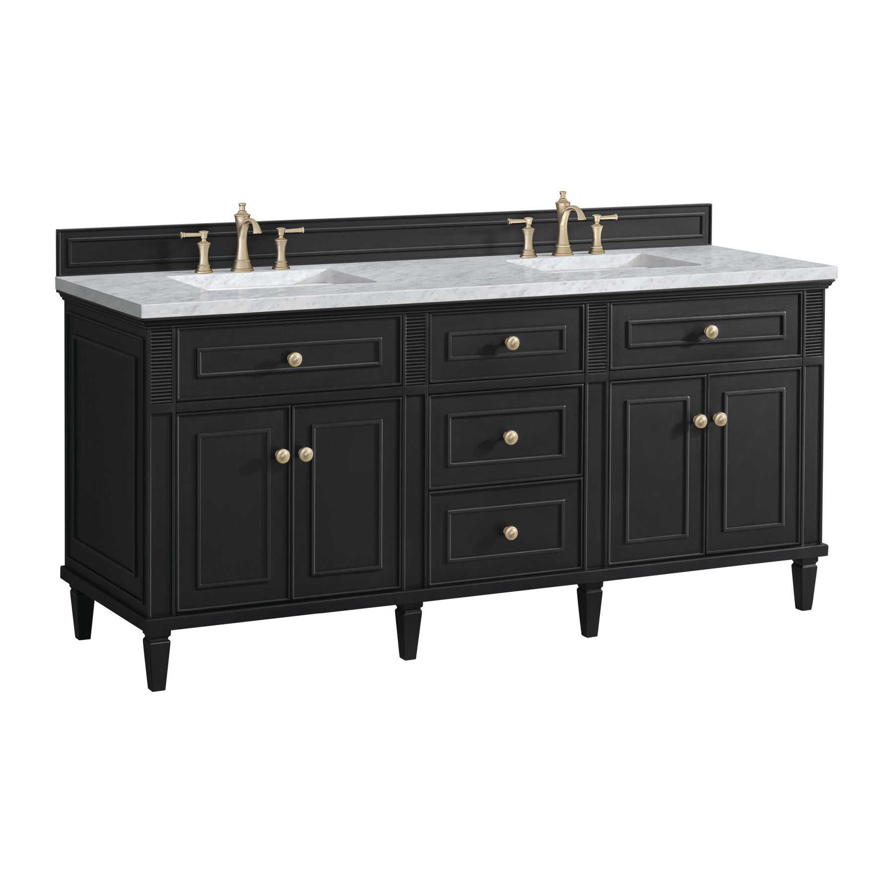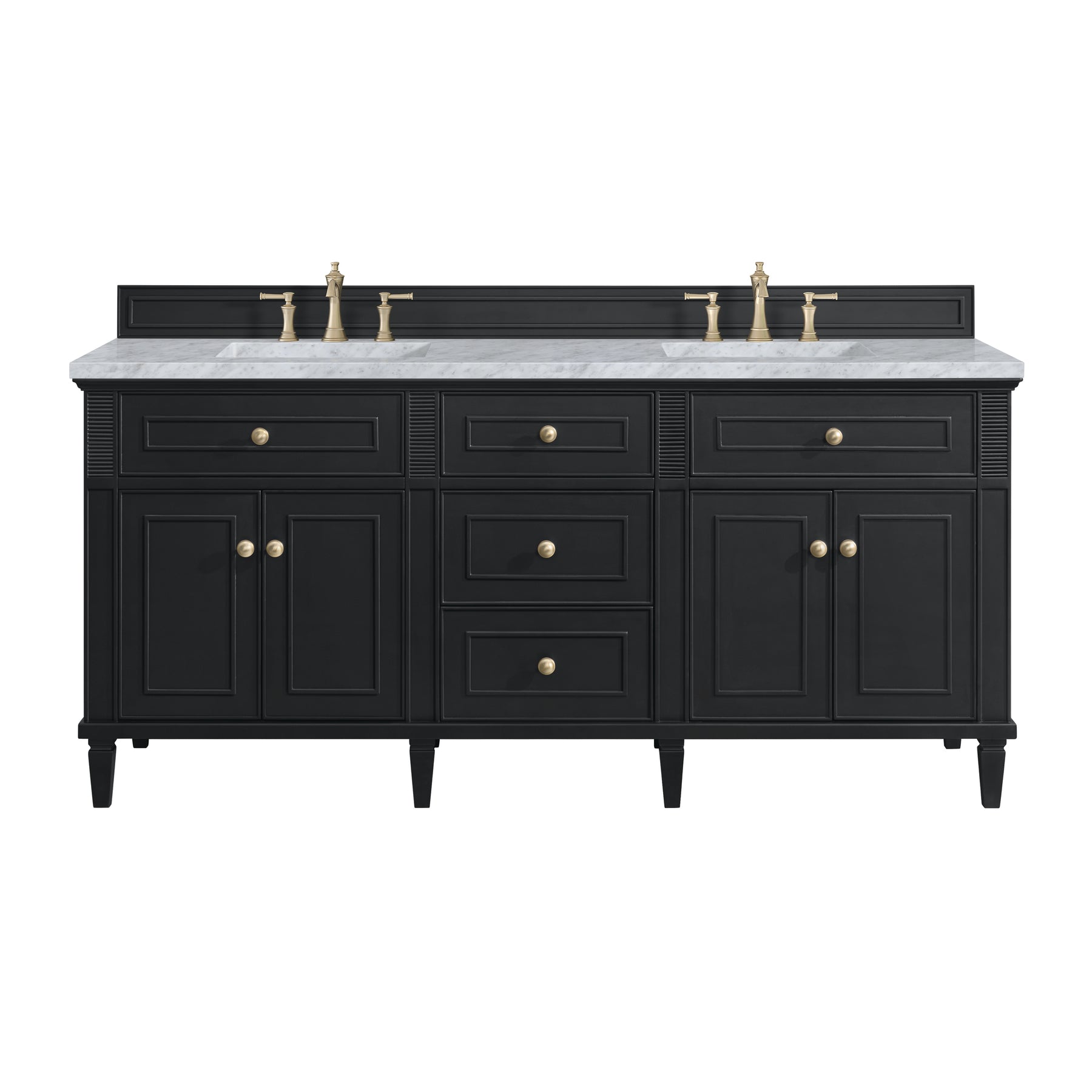 The 72” Lorelai Double Vanity celebrates timeless form and exquisite finish details, combined with practical function. The rich Black Onyx finish is accented by coin-edge knobs in Champagne Brass which provides an sophisticated contrast. Reeded details, and clean, and raised picture frame molding lend visual interest. This four-door cabinet opens to spacious interior with shelves and convenient USB/Electric power outlets. Three traditional drawers and two tip-outs offer additional storage space. Completing this vanity, are the treasured, neutral tones and textures of the Carrara marble vanity top display a white background with delicate grey veining.