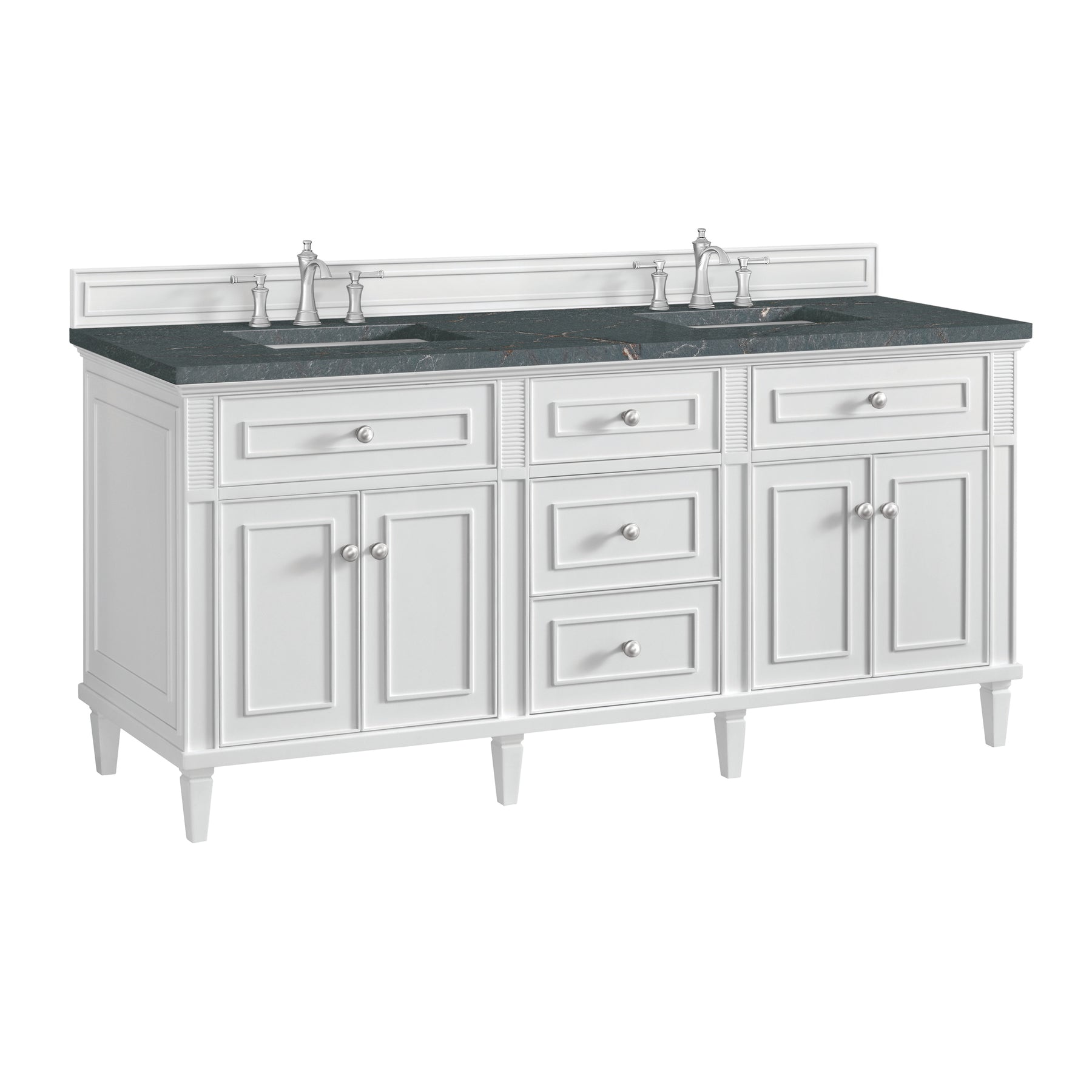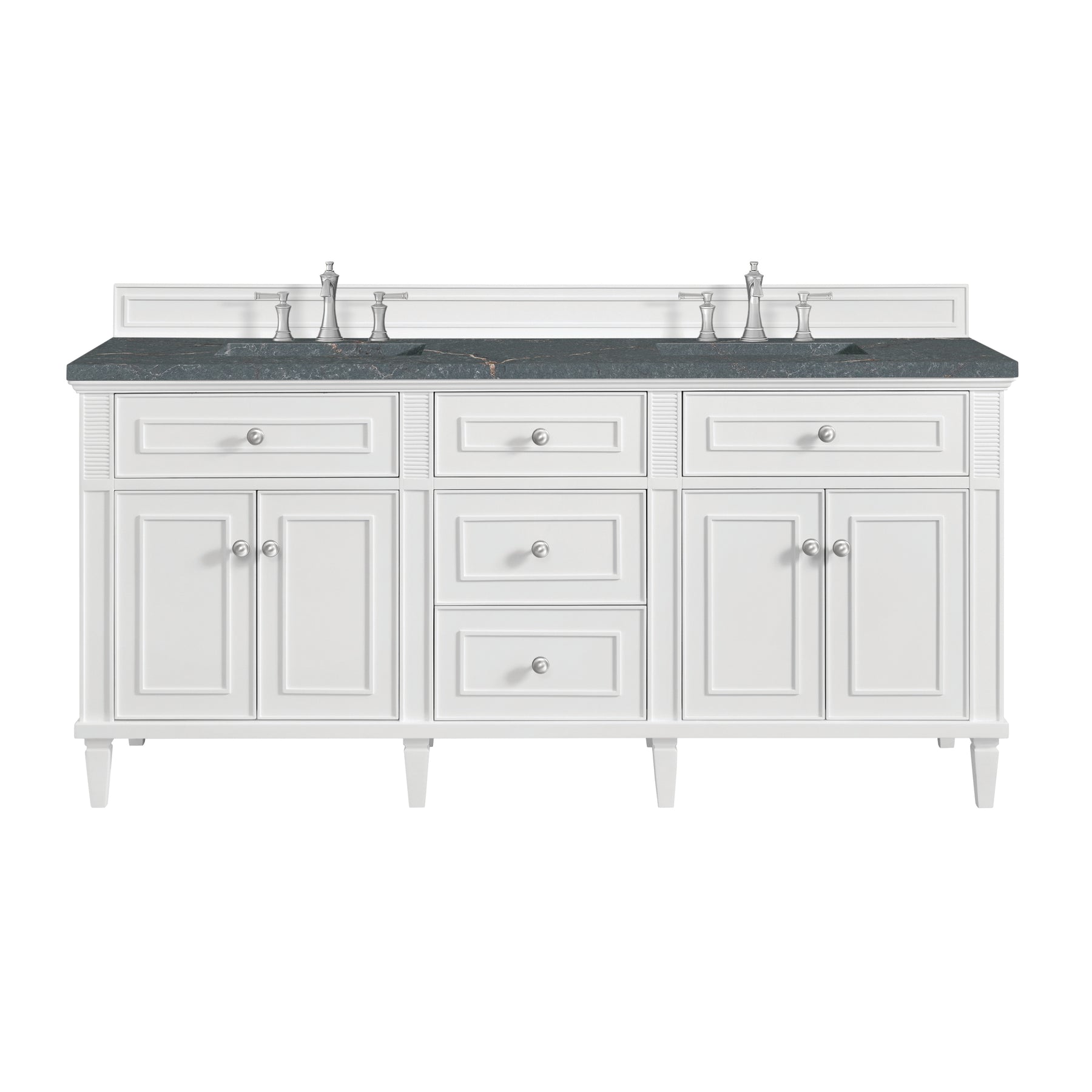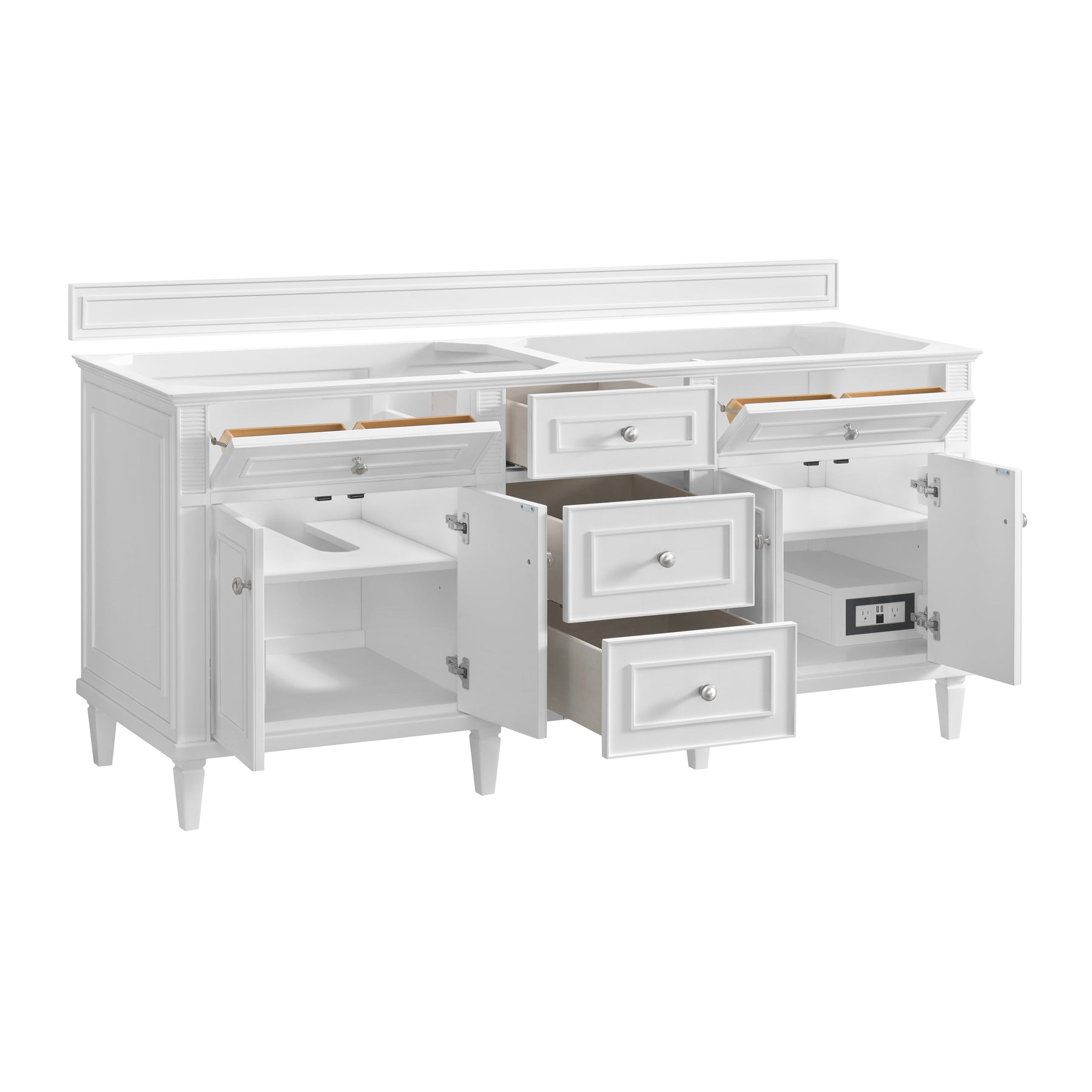 The 72” Lorelai Double Vanity celebrates timeless form and exquisite finish details, combined with practical function. The sophisticated Bright White finish is accented by reeded details, and clean, raised picture frame molding. Coin-edge knobs in Satin Nickel provide the perfect accent. This four-door cabinet opens to spacious interior with shelves and convenient USB/Electric power outlets. Three traditional drawers and two tip-outs offer additional storage space. The finish and hardware accents are enhanced by the Parisien Blue Silestone top, offering a deep bluish hue with broad and intricate neutral veins highlighted by fine coppery accents.