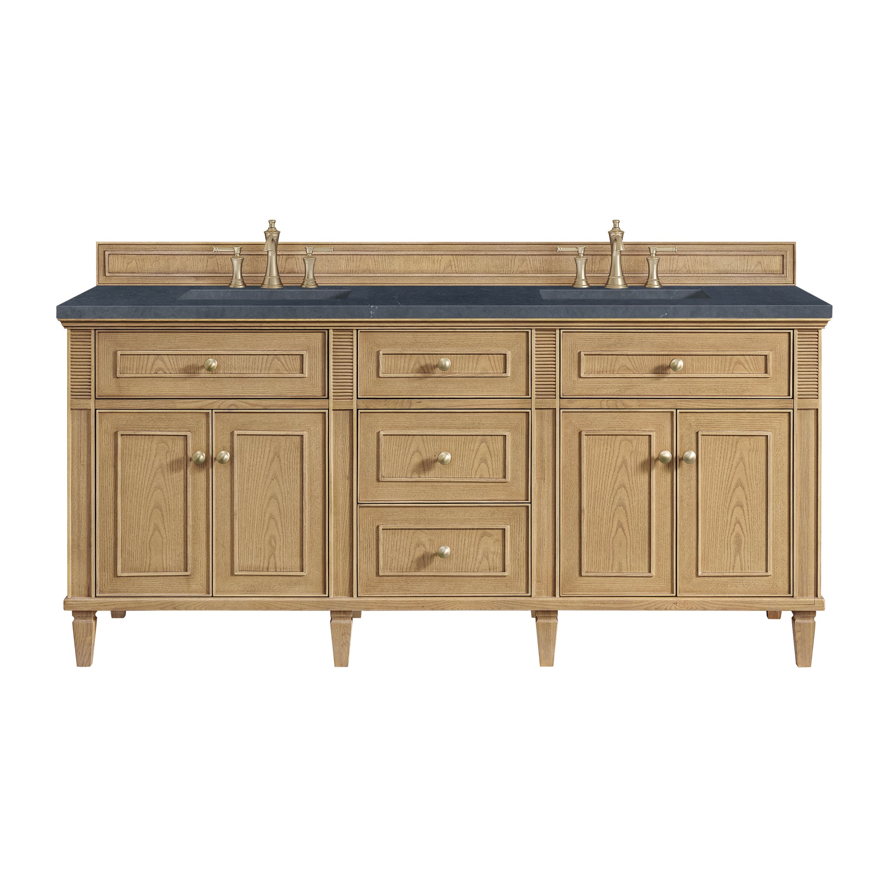 The 72” Lorelai Double Vanity celebrates timeless form and exquisite finish details, combined with practical function. The beauty of the natural grains in the walnut veneer is accented by reeded details, and clean, raised picture frame molding. The decorative, coin-edge knobs in Champagne Brass provide the perfect accent to the Light Natura Oak finish. This four-door cabinet opens to spacious interior with shelves and convenient USB/Electric power outlets. Three traditional drawers and two tip-outs offer additional storage space. Completing this piece is a distinguished top, characterized by depth and a sense of movement with a suede finish. The Charcoal Soapstone Silestone top is a timeless statement to complete the look of your vanity.