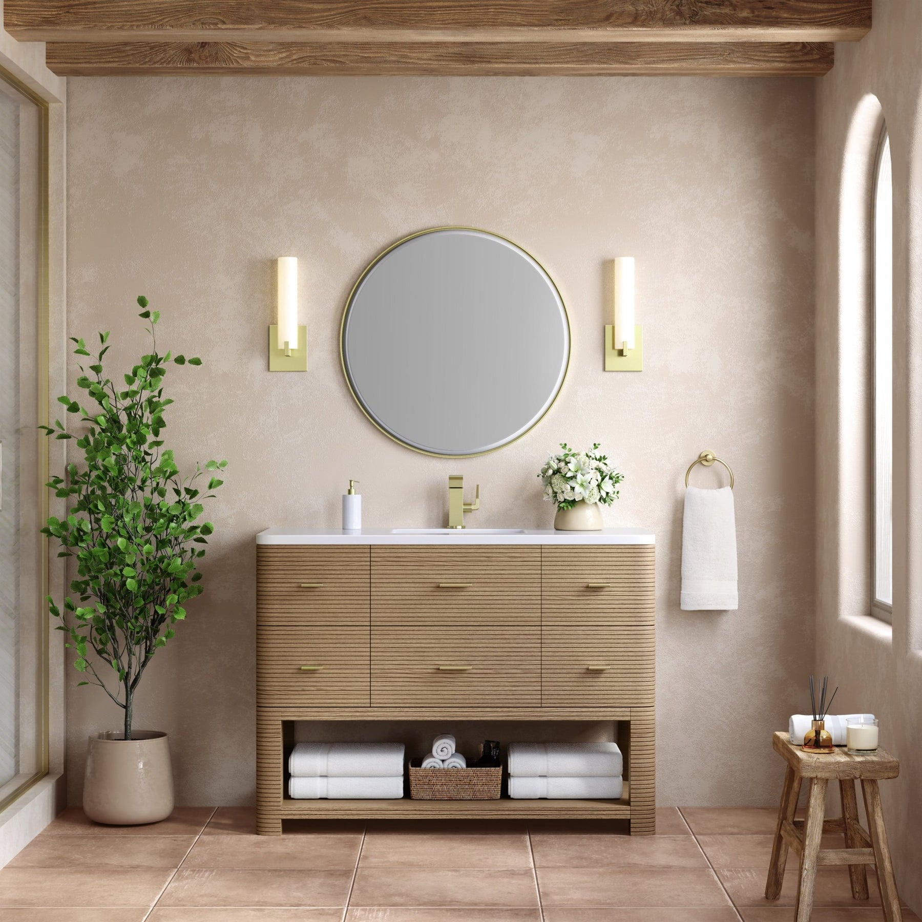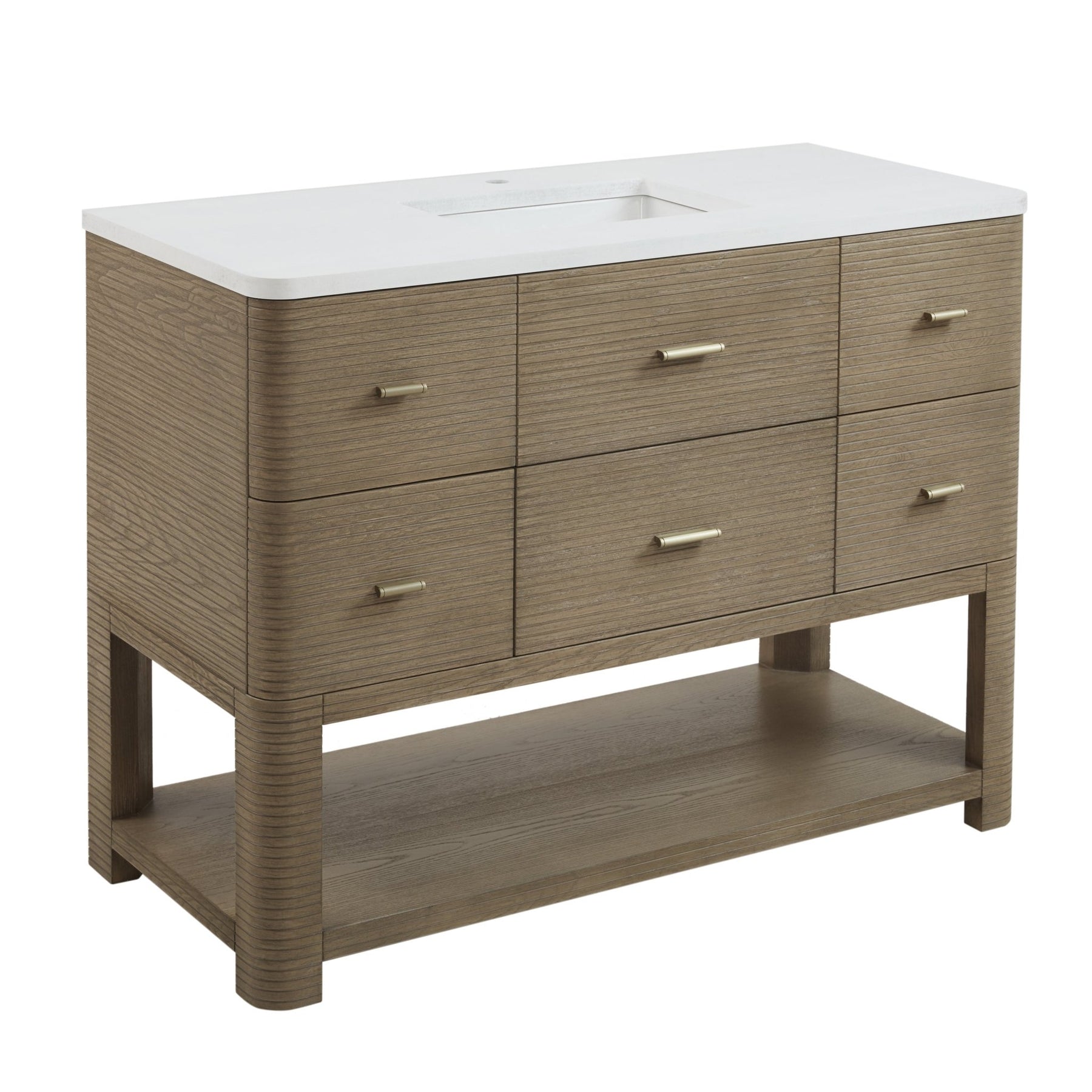 The Lucian 48” single vanity is a visual delight, boasting a rich Pebble Oak finish that adds warmth and character to your space. Complemented by Champagne Brass hardware, the ribbed detailing is meticulously crafted. Enjoy ample storage with one tip-out drawer and five traditional drawers, while a lower exposed shelf adds versatility to your storage solutions. With the addition of a classic White Zeus Silestone top and undermount porcelain sink, this vanity is a seamless integration of modern design and functionality.