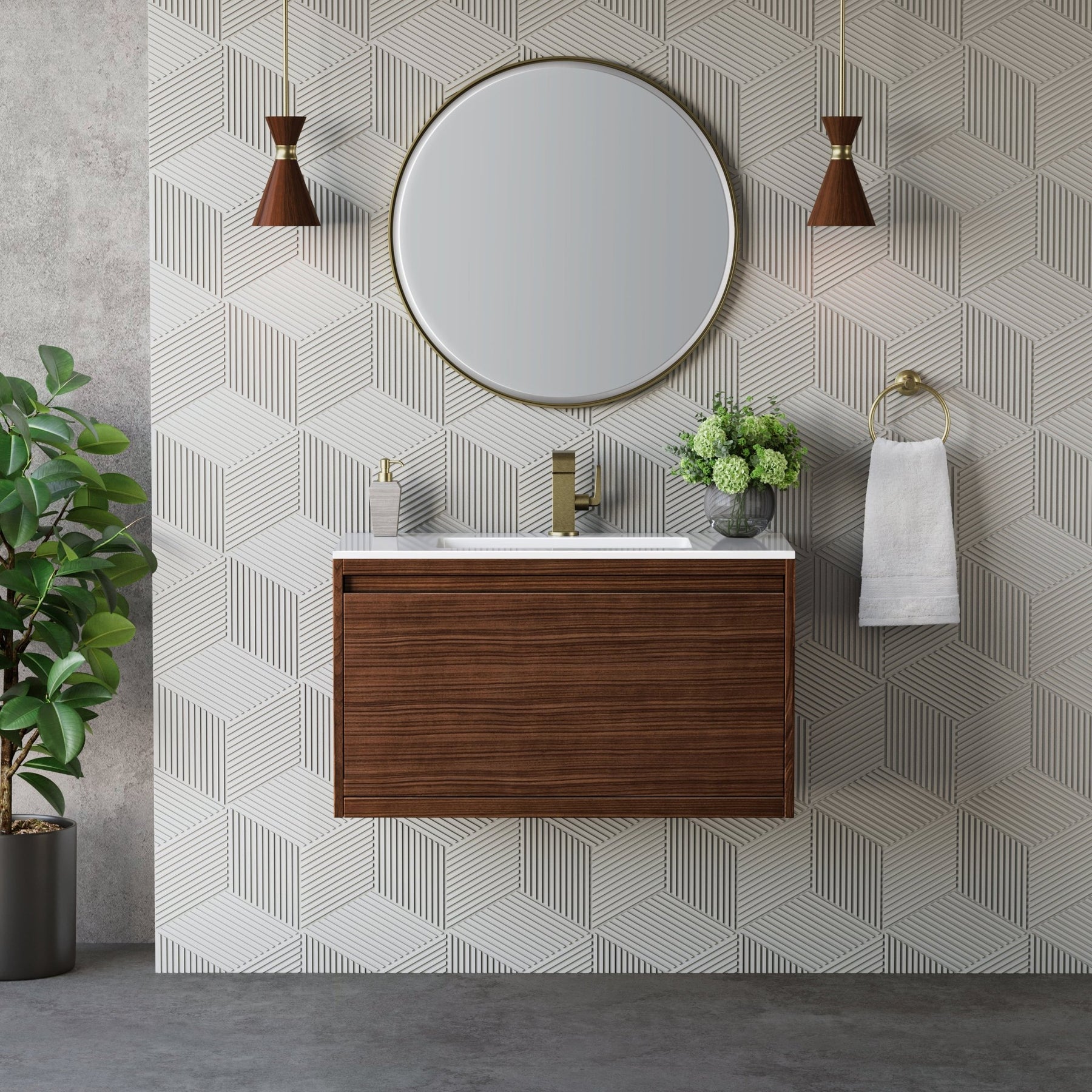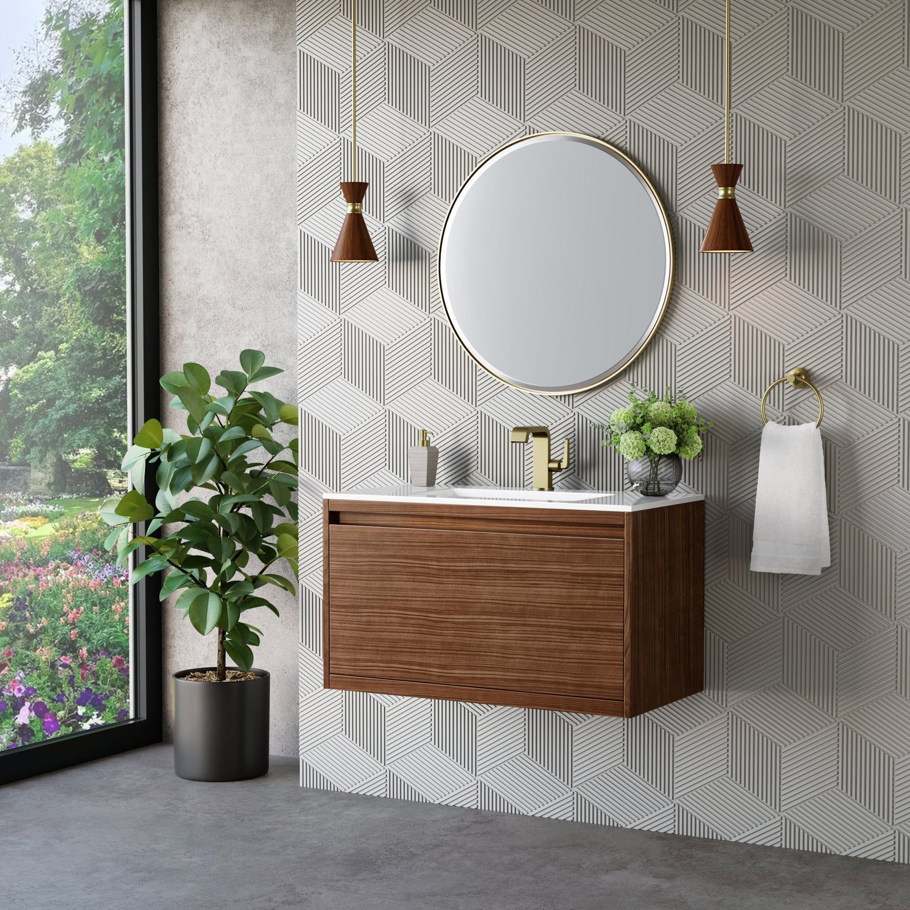 The Mantova 35.4” Mid-Century Walnut Single Vanity by James Martin Vanities will elevate your space by adding a touch of timeless décor to your bathroom. This vanity combines a cutting-edge design with pristine craftmanship to bring your bathroom a clean modern look providing you with both style and functionality. Generous storage features include soft-close drawers with one removable drawer organizer. The look is completed with Champagne Brass finished Stainless Steel Base and a Glossy White Composite Stone integrated top and sink.
