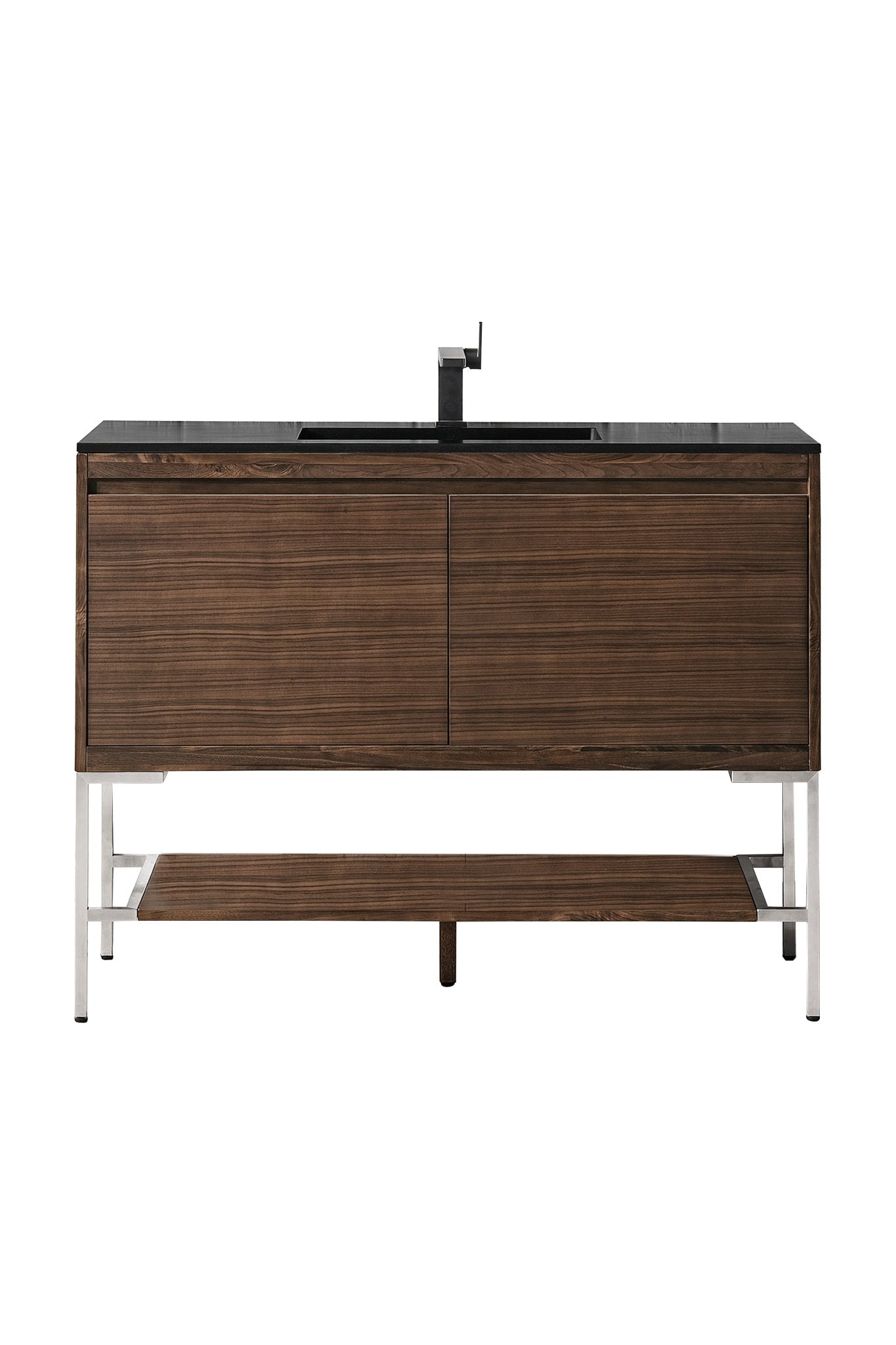 The Mantova 47.3” Mid-Century Walnut Single Vanity by James Martin Vanities will elevate your space by adding a touch of timeless décor to your bathroom. This vanity combines a cutting-edge design with pristine craftmanship to bring your bathroom a clean modern look providing you with both style and functionality. Generous storage features include soft-close drawers with one removable drawer organizer. The look is completed with Brushed Nickel finished Stainless Steel Base and a Charcoal Black Composite Stone integrated top and sink.