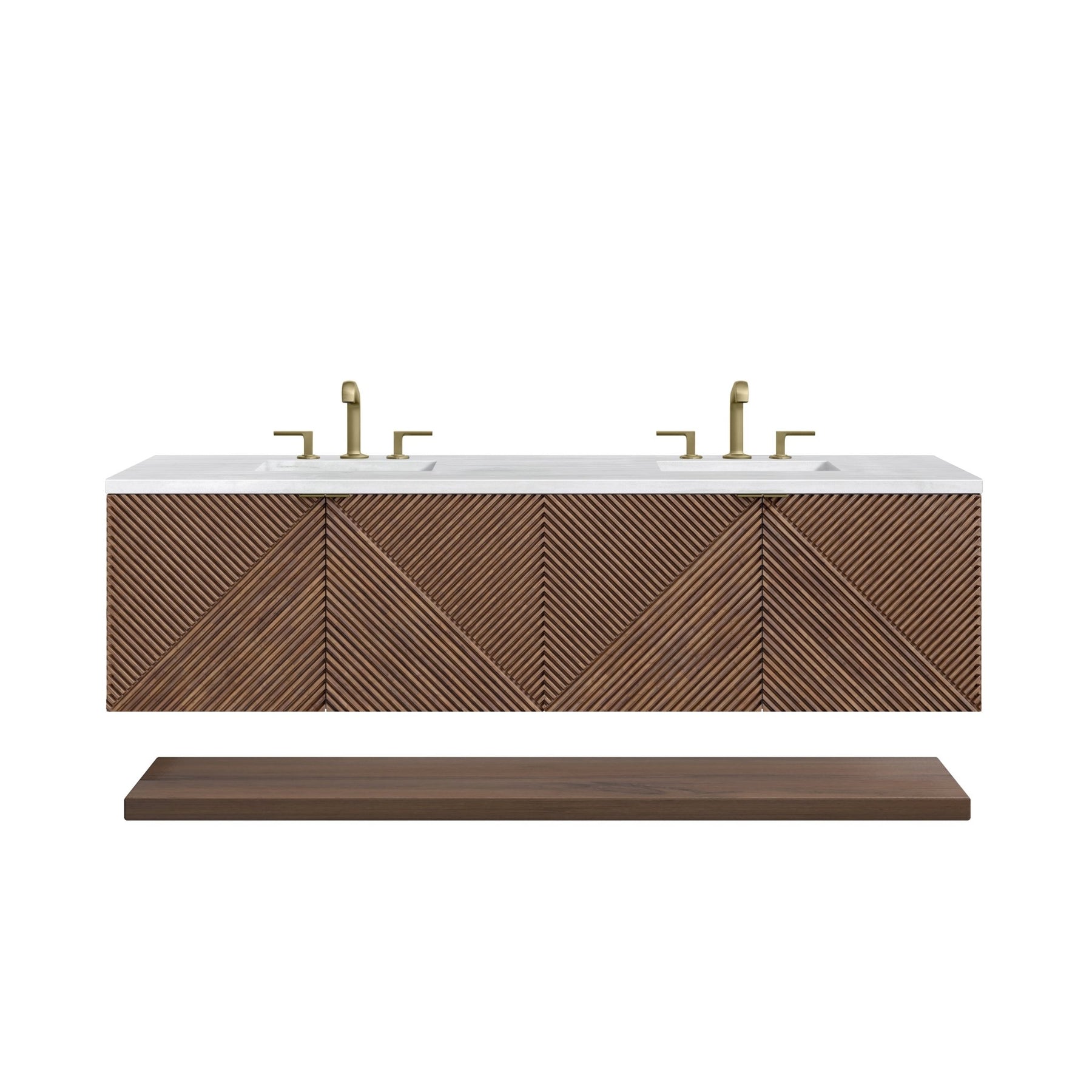The 72" Marcello wall-mounted vanity adds a touch of mid-century modern charm to your bathroom, while the warm Chestnut finish gives it a timeless elegance. The reeded, patterned detail on the door fronts continues around the sides in geometric perfection. Crafted from solid Acacia, with rich, resawn Acacia veneer over Marine MDF, accented by sleek, tab-style door pulls in Champagne Brass. Two spacious interior drawers are framed on the top by a generous shelf and feature our signature aluminum laminate liners and full extension, soft-close undermount glides. A floating shelf, mounted separately, adds a modern and visually balanced storage solution. The wall-hanging feature contemporizes the look with an easy-to"stall bracket system included. The 3 CM countertop, pre-drilled for an 8" widespread faucet, includes mounting hardware for the porcelain undermount sink. Adding an elegant contrast to the rich wood with Champagne Brass hardware, the 3 cm solid surface Arctic Fall vanity top displays horizontal grey veining giving you the look of expensive marble without the cost.