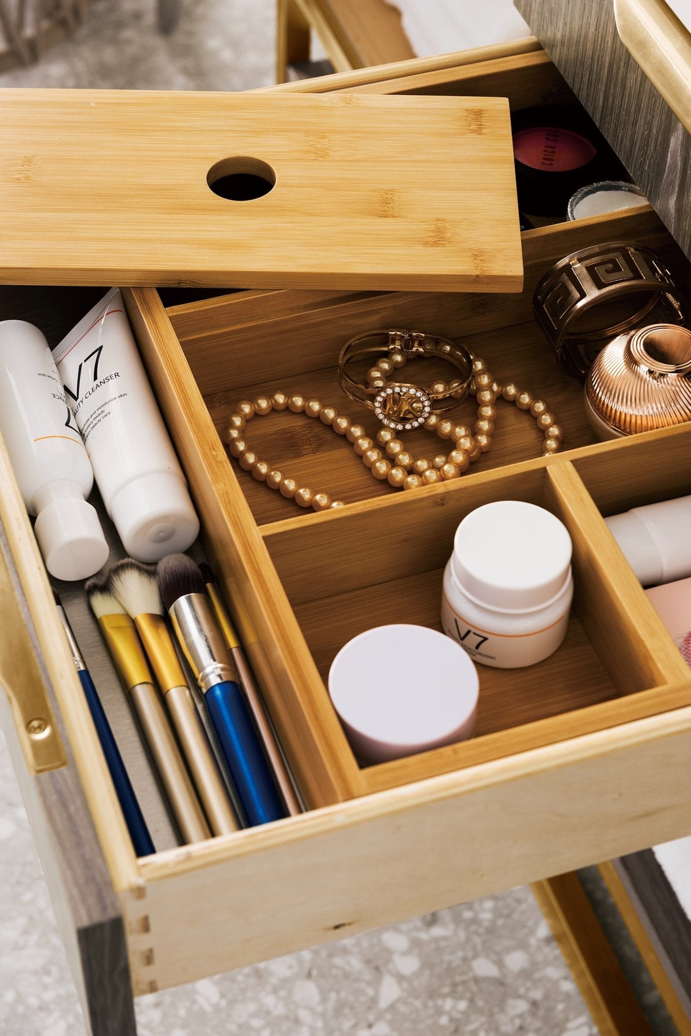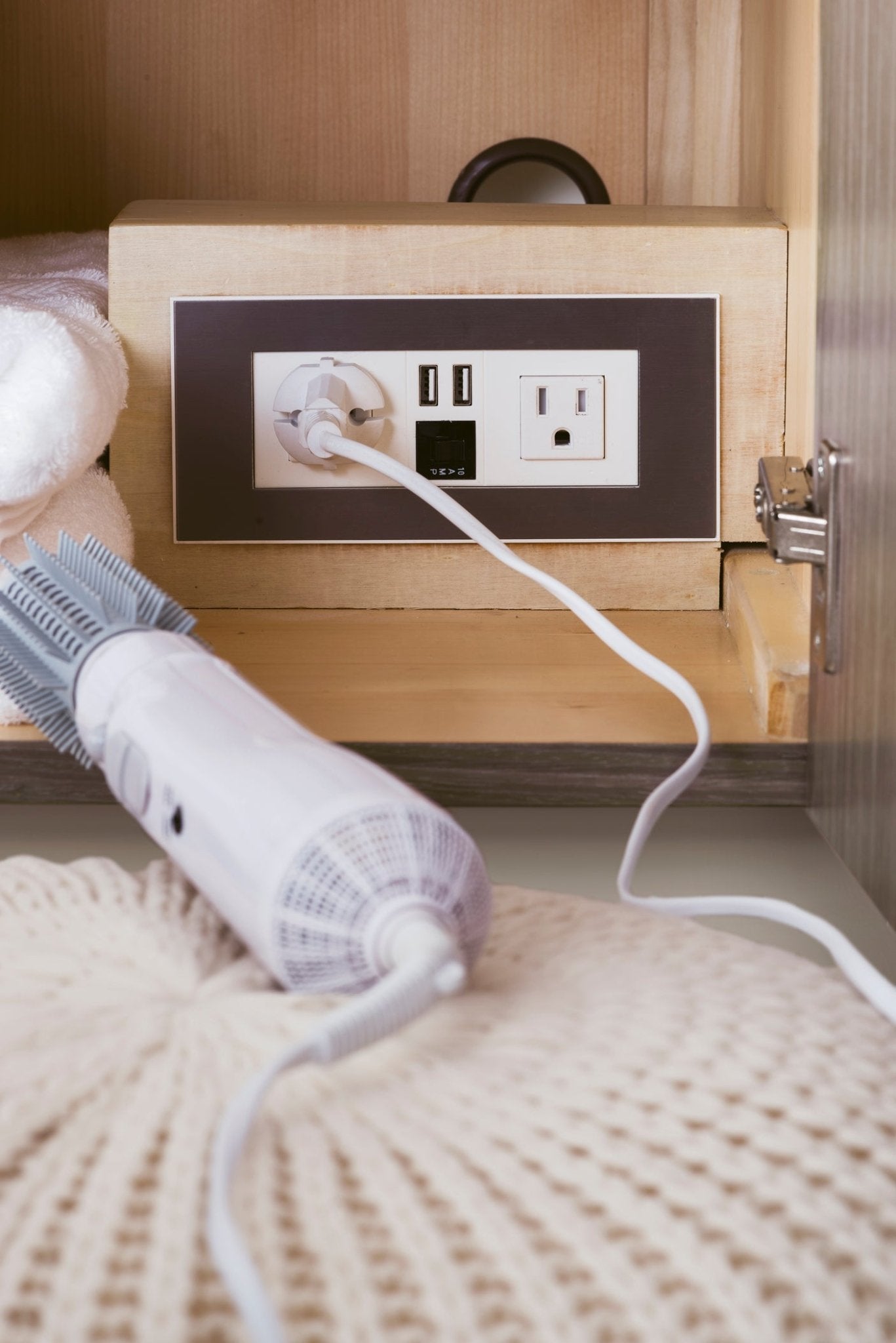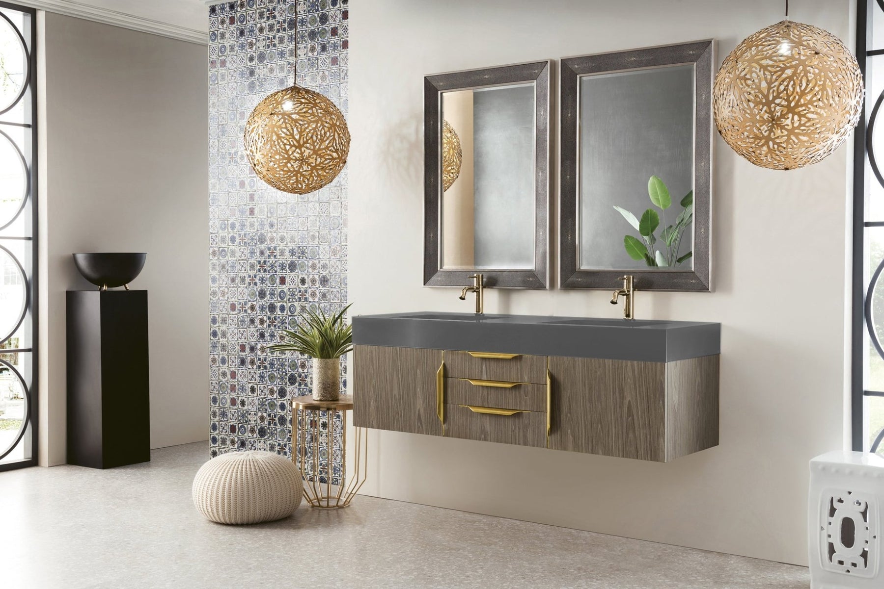 The Mercer Island 59" Ash Gray Double Vanity offers maximum storage with two soft-closing doors, three soft-closing drawers, and lower shelf space. This cabinet includes premium features such as one solid bamboo drawer organizer and one 120 Volt UL Rated electrical component with two electrical and two USB outlets. Cabinet includes Radiant Gold door and drawer pulls. Dusk Grey Composite Stone countertop with integrated sink included. This wall-mounted vanity includes heavy duty mounting brackets to create a modern look.