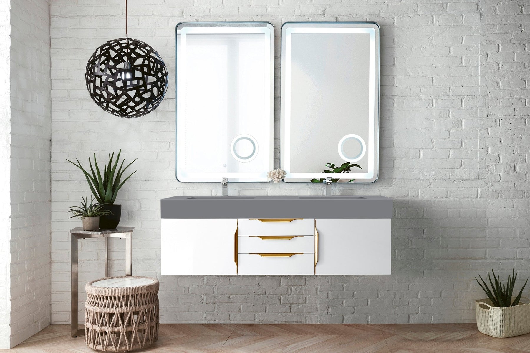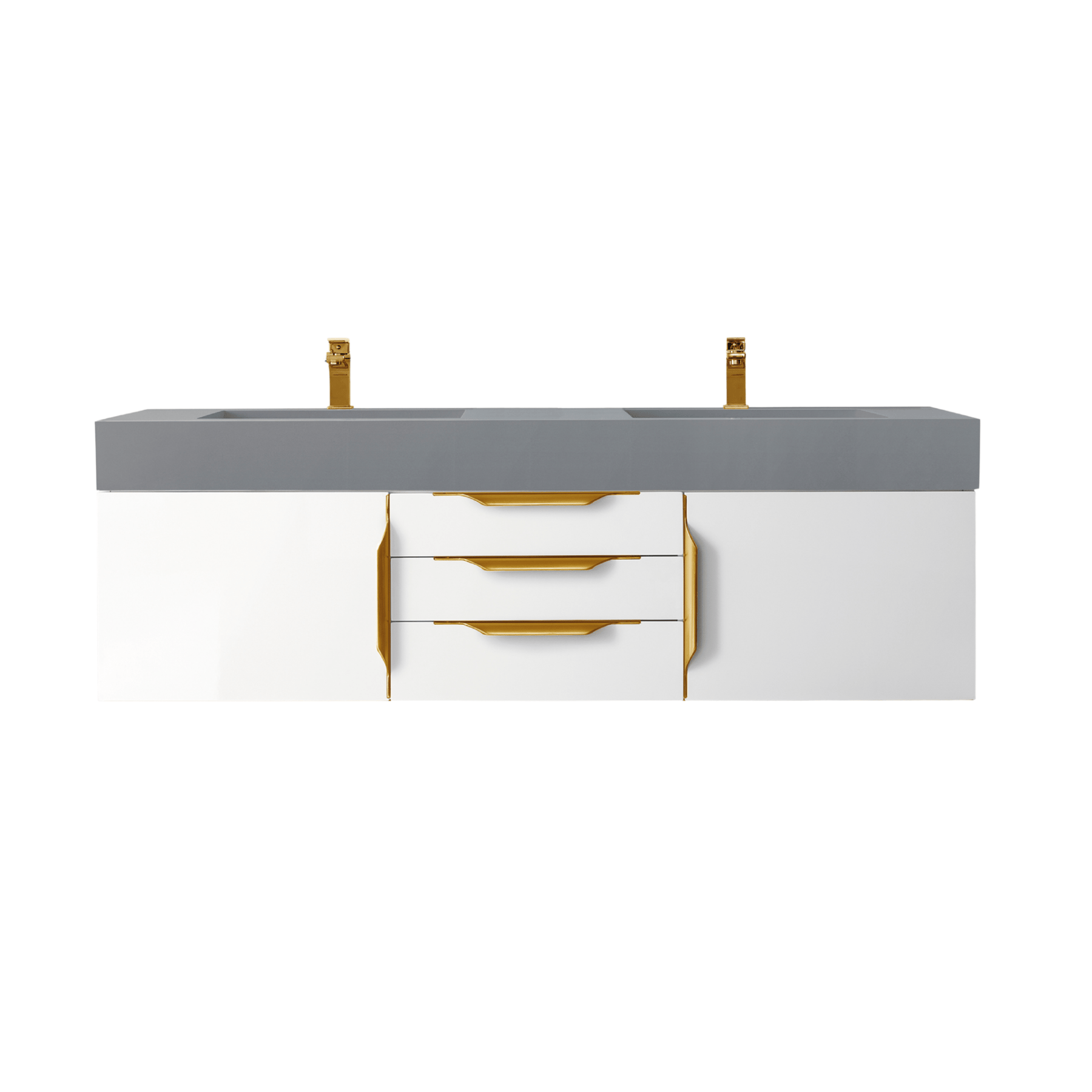 The Mercer Island 59" Glossy White Double Vanity offers maximum storage with two soft-closing doors, three soft-closing drawers, and lower shelf space. This cabinet includes premium features such as one solid bamboo drawer organizer and one 120 Volt UL Rated electrical component with two electrical and two USB outlets. Cabinet includes Radiant Gold door and drawer pulls. Dusk Grey Composite Stone countertop with integrated sink included. This wall-mounted vanity includes heavy duty mounting brackets to create a modern look.