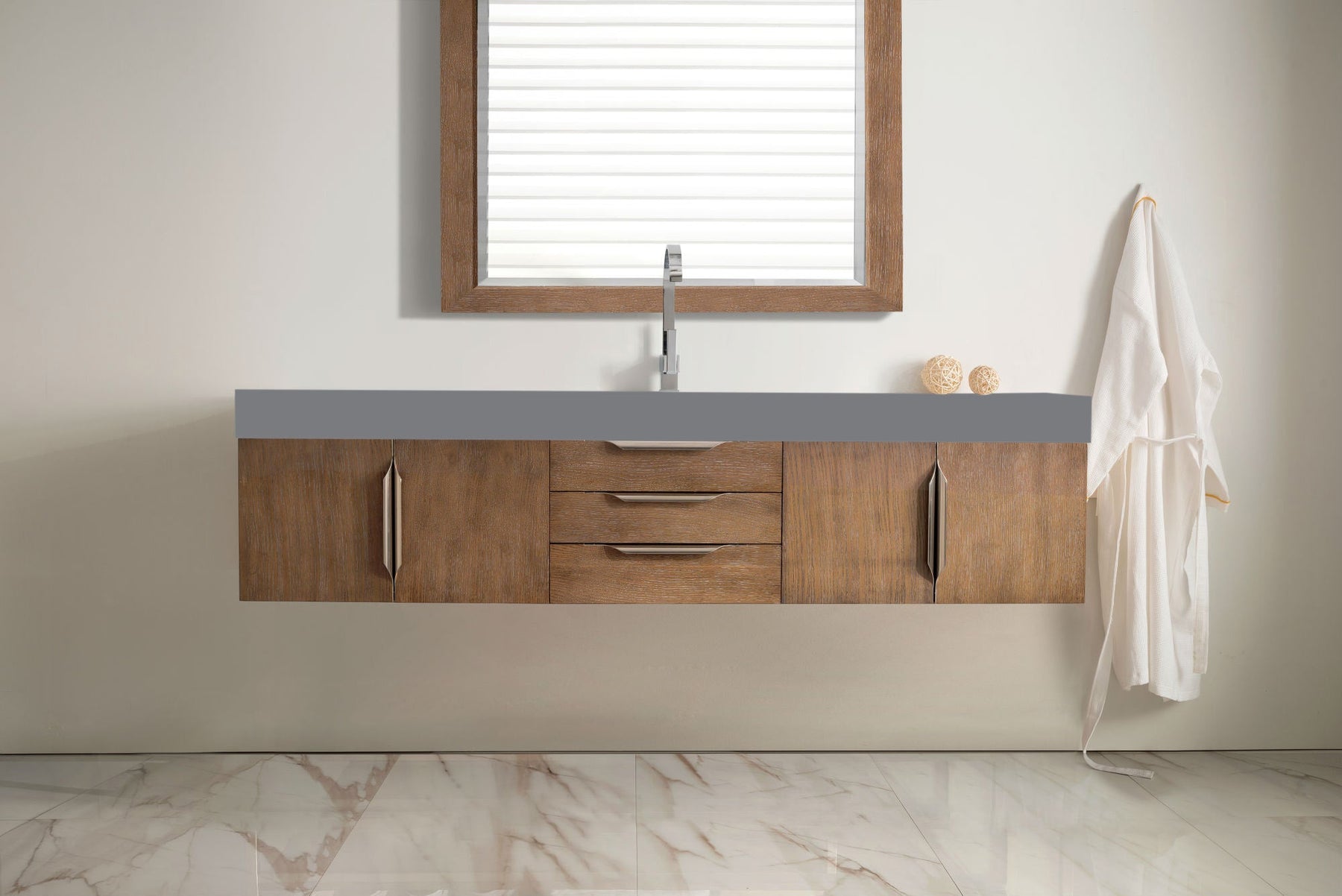 The Mercer Island 72" Latte Oak Single Vanity offers maximum storage with four soft-closing doors, three soft-closing drawers, and lower shelf space. This cabinet includes premium features such as one solid bamboo drawer organizer and one 120 Volt UL Rated electrical component with two electrical and two USB outlets. Cabinet includes Brushed Nickel door and drawer pulls. Dusk Grey Composite Stone countertop with integrated wide, angled trough-style sink. This wall-mounted vanity includes heavy duty mounting brackets to create a modern look.