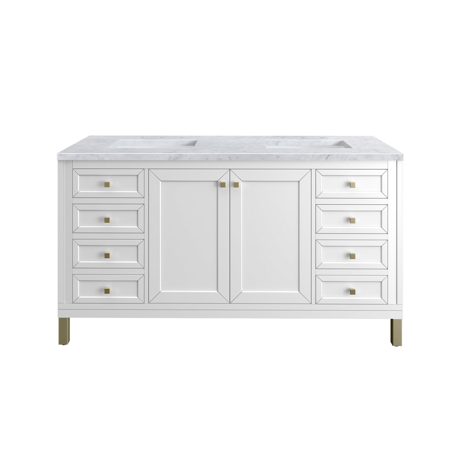 Chicago 60" Double Vanity, Glossy White, w/ 3 CM Carrara Marble Top