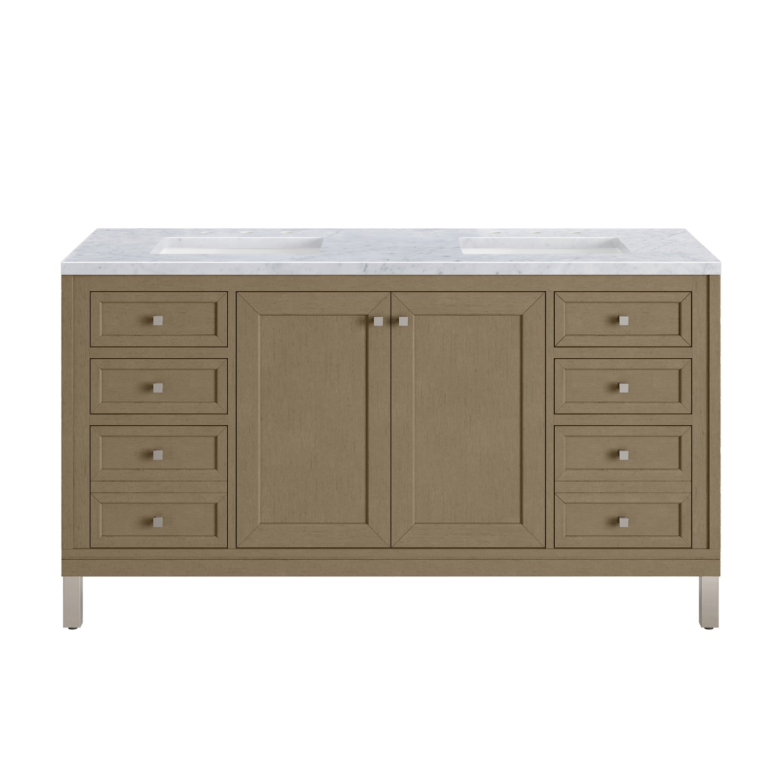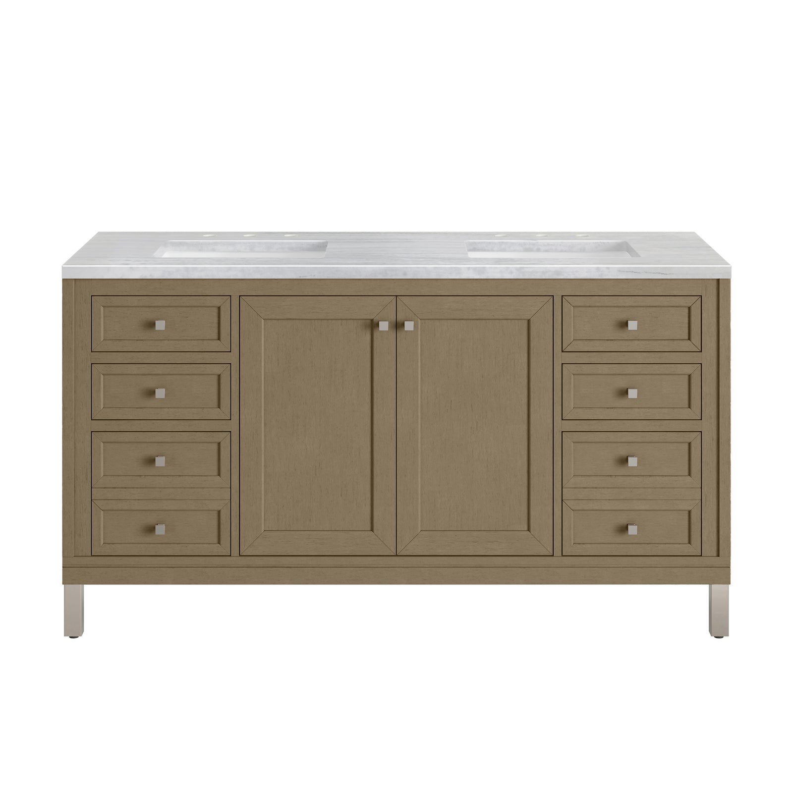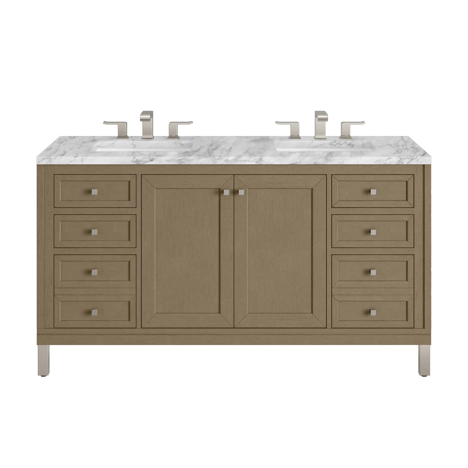 Chicago 60" Double Vanity, Walnut Whisper, w/ 3 CM Carrara Marble Top