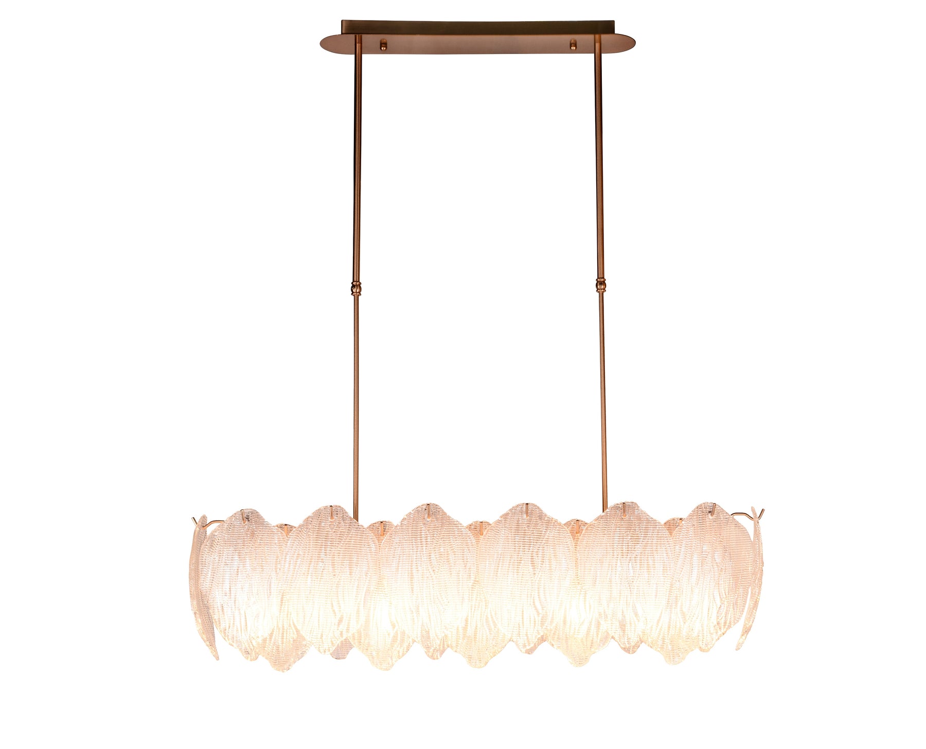 This Unique Oval chandelier adds glamorous, vintage-inspired detail to your kitchen or dining area. Sturdily crafted with a steel frame and finished in distressed gold, this organic oval Island pendant gives us a layered look where each etched glass leaf is placed one by one on the frame until the chandelier is in full bloom. An etched organic design brings elegant texture to a classic glass island light. The distressed Gold finish completes the antique feel of this beautiful fixture. Uses telescopic rods for adjustable height.