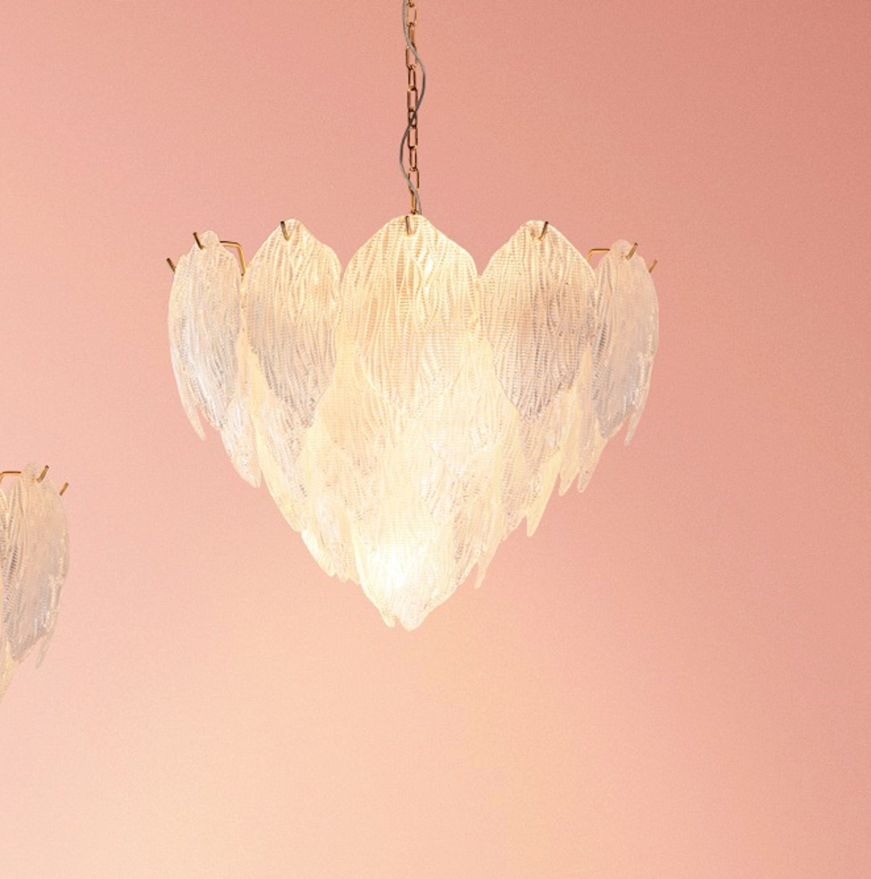 This sparkling 27" tall chandelier adds glamorous, vintage-inspired detail to your nursery, bedroom or kitchen. Sturdily crafted with a steel frame and finished in distressed gold, this organic chandelier gives us a layered look where each etched glass leaf is placed one by one on the frame until the chandelier is in full bloom. An etched organic design brings elegant texture to a classic glass chandelier. The distressed Gold finish completes the antique feel of this beautiful fixture.