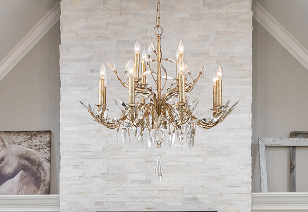 A love for outdoor style and the simple flow of a flowering vine is the design inspiration for this chandelier. Showing off our love for a traditional shape and a simple silver metallic finish, this elegant crystal chandelier from Lucas McKearn is perfect for a dining room, kitchen or bathroom application. Using the silver with an antique glaze mix, this chandelier's finished metal is formed into a beautifully curved frame that highlights clear hand-cut crystal accents, making this distressed champagne and crystal twelve light chandelier a must-have for your glamorous and sophisticated space.