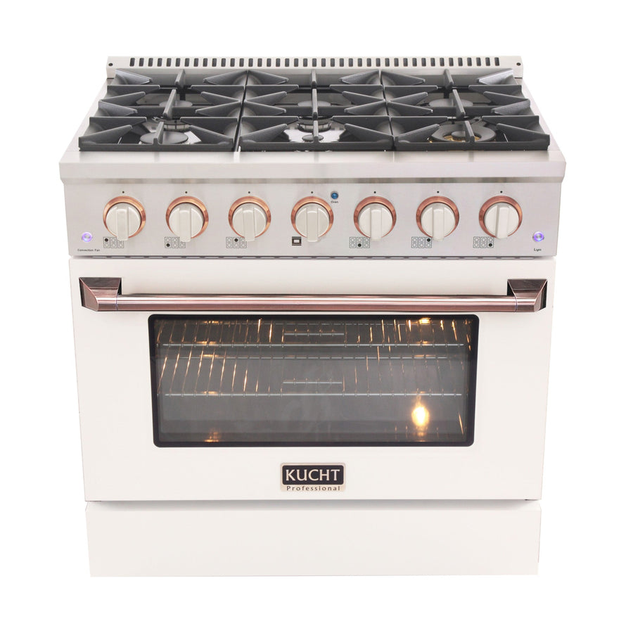 KUCHT Professional 36 in. 5.2 cu. ft. Natural Gas Range with Sealed Burners and Convection Oven in Stainless Steel with White Oven Door, White Knobs and Rose Gold Handle & Rose Gold Knobs Rings