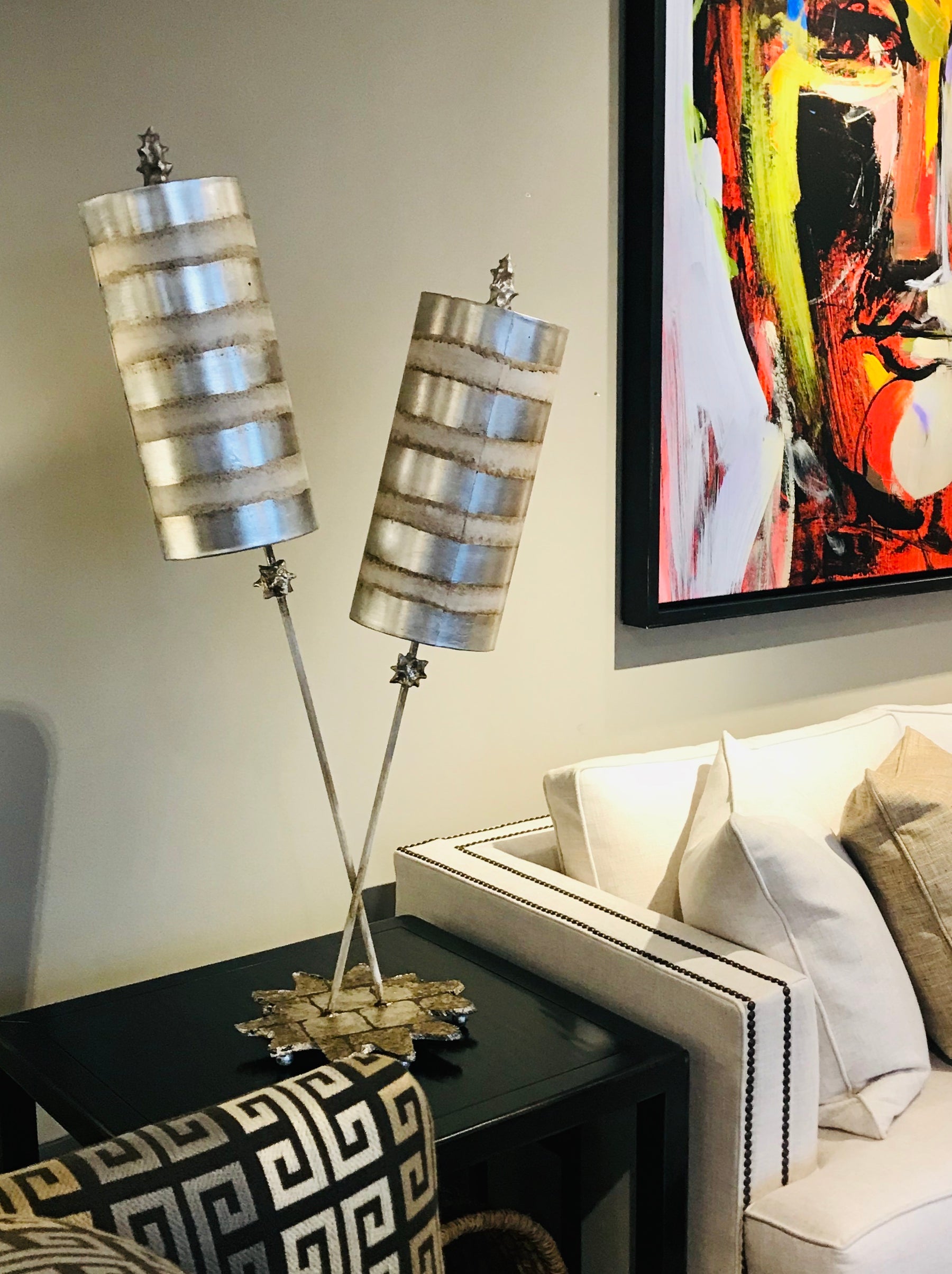 Illuminate your space in a Charming Whimsical style with this 40" double Buffet Table lamp. Displaying Hand sculpted resin and a clean painted finish, this lamp features a unique gold striped shade topped with a carved finial in distressed silver. Bright light at the top and bottom give the perfect amount of light for your space. A star shaped base in Flambeau's distressed gold , and a simple on off switch on the cord, makes this Large Table lamp easy to operate, and functional while showing off its updated traditional looks.