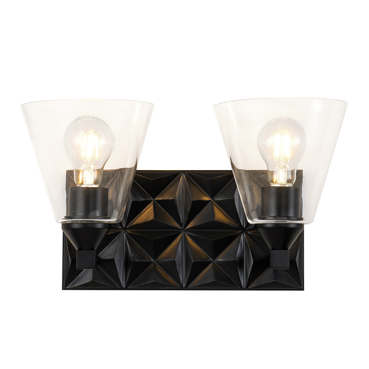 Always looking to add texture and dimension to a room, we created the perfect 2-light wall sconce. The 15.5 inch rectangle back plate with a pressed textured shape creates a modern design completing our intent. Showcasing the elegant Matte Black finish and a sleek cone-shaped, clear shade that can be mounted either up or down, we are giving that extra touch to show our attention to design and our love for the details.