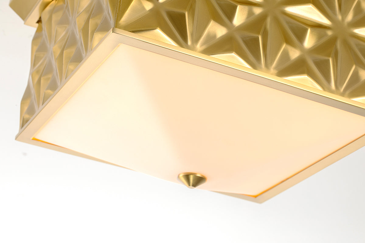 Always looking to add texture and dimension to a room, we created the perfect 14.5 inch square flush mount ceiling light. The sophisticated design of this lighting fixture uses shape and its aged brass finish to add traditional design and eye-catching appeal. Approved for damp location, this flush mount will work in a bathroom design as well as a kitchen or living room space. The creamy white glass allows just the right amount of light to create a beautiful, flattering ambiance giving off just the right amount of light.