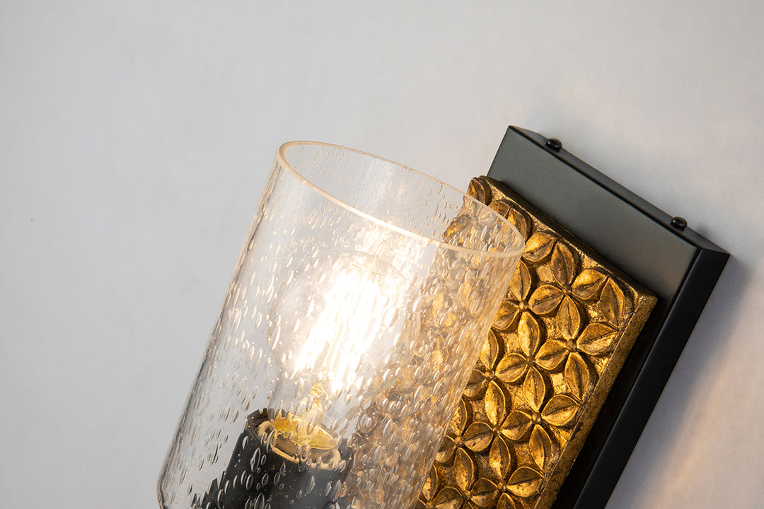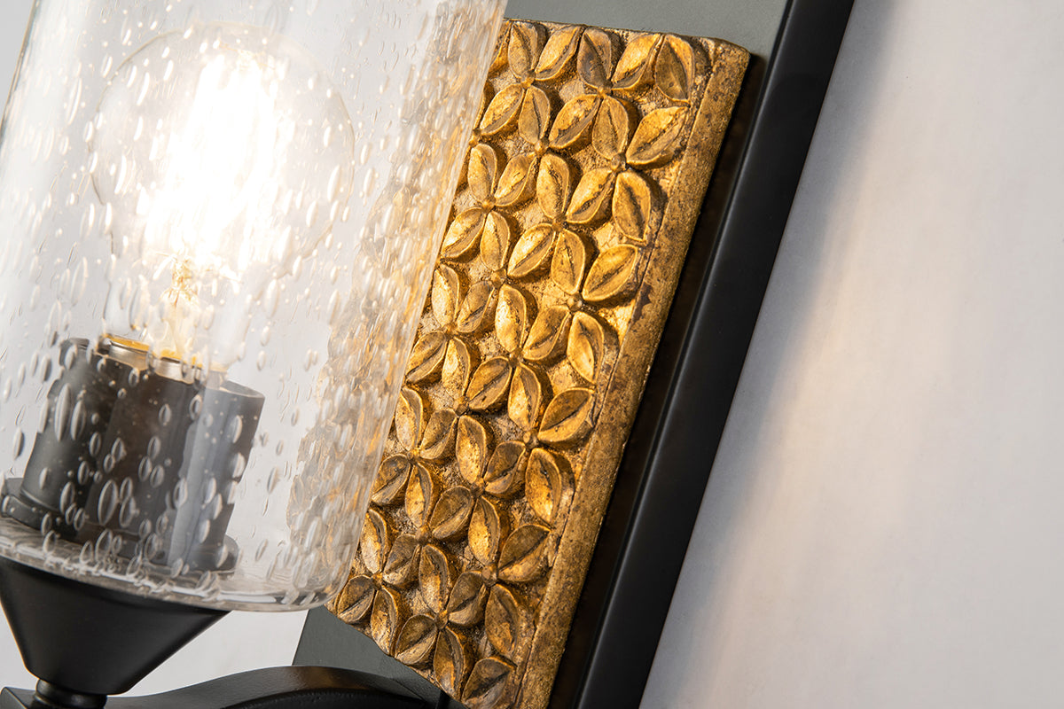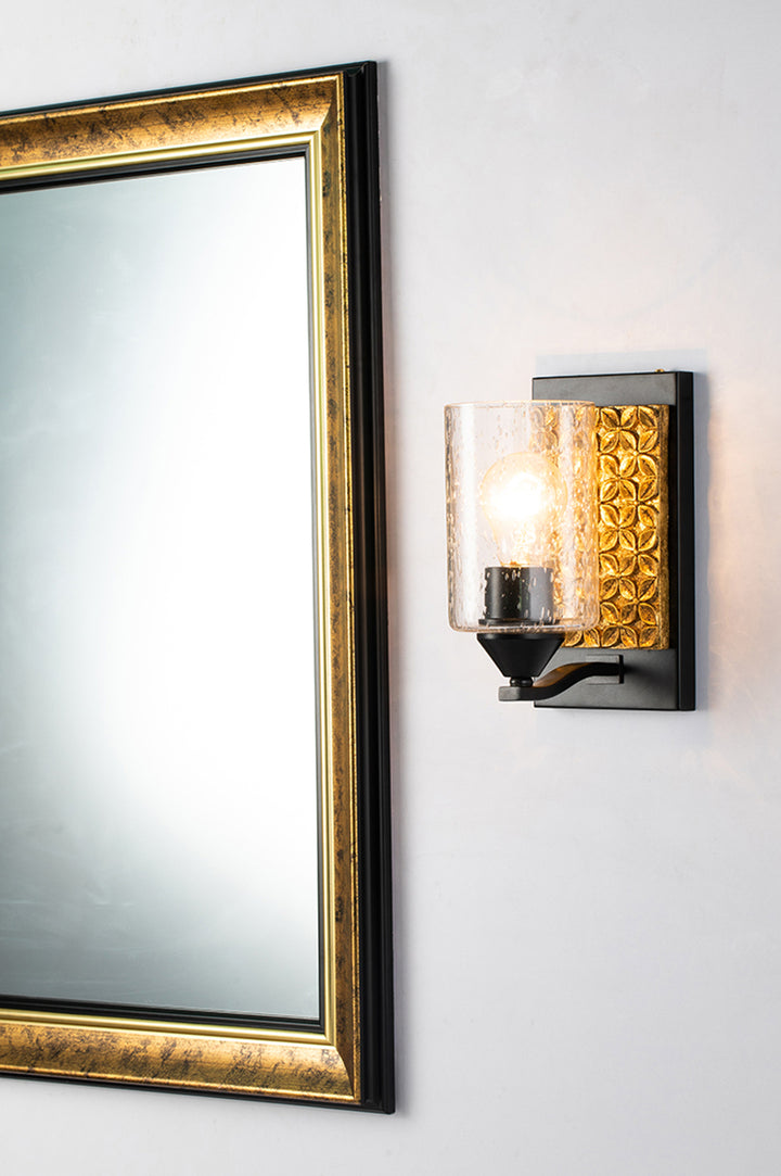 Perfect for brightening your hallway, bathroom or living space, this 1-light wall sconce features a clean-cut rectangle backplate with textured shapes, simple curved arm and a unique two toned finish of matte black and antiqued gold. Showing off its contemporary side, this one-light sconce uses a cylinder shaped clear seeded glass to bring attention to the mix of texture and detail that come together in our Arcadia collection.