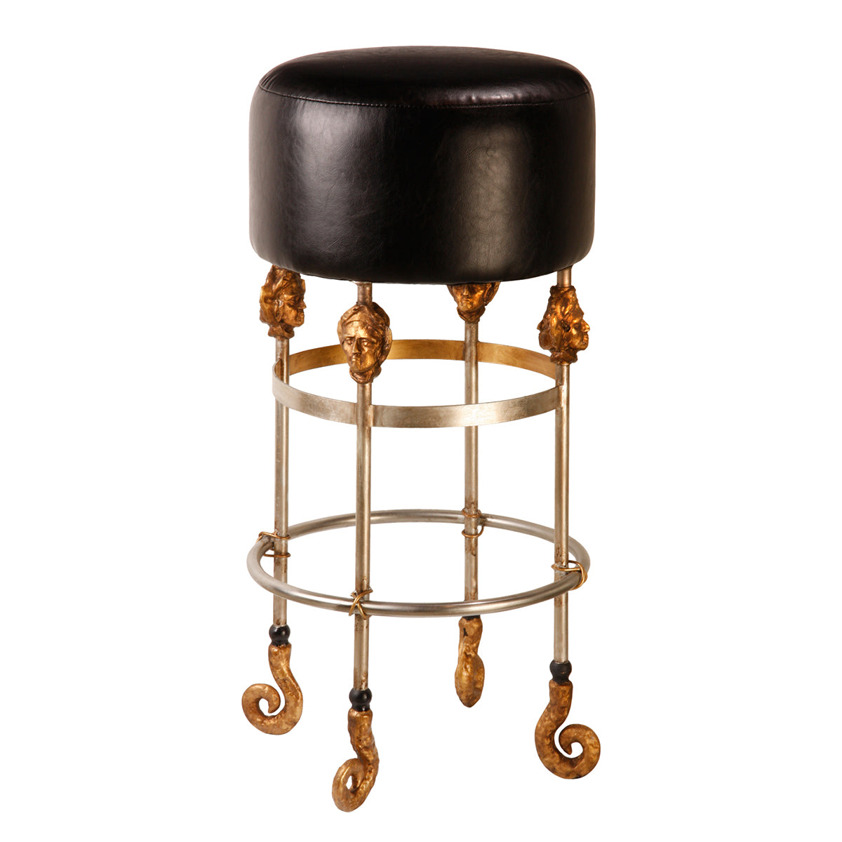 - Gilded swirl feet support silver and gold leaf decorative face fragments on legs. Topped with black leather seat