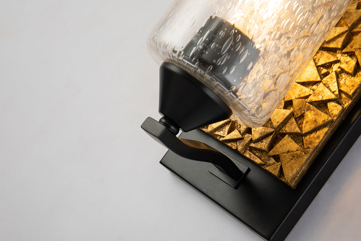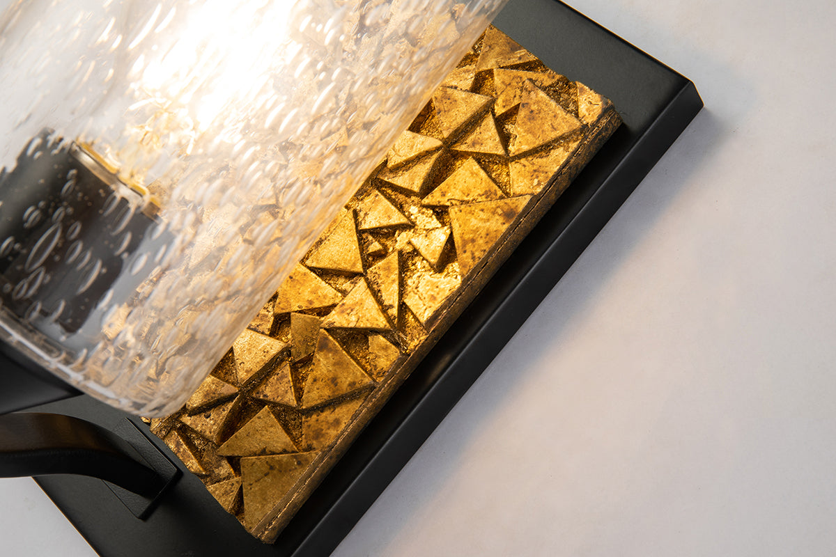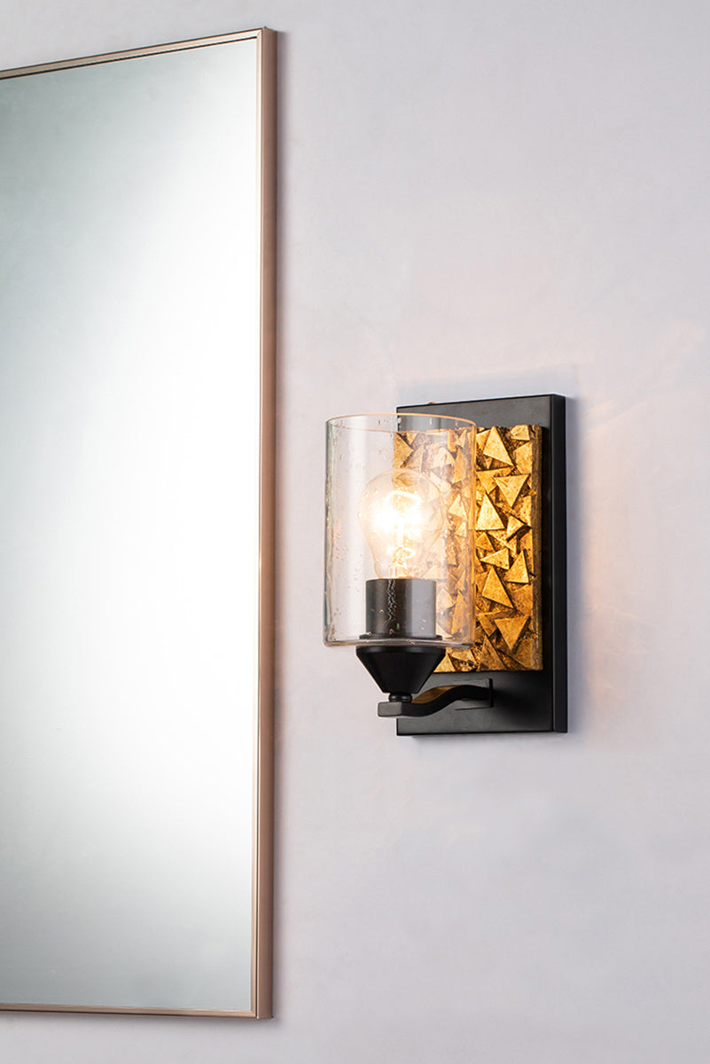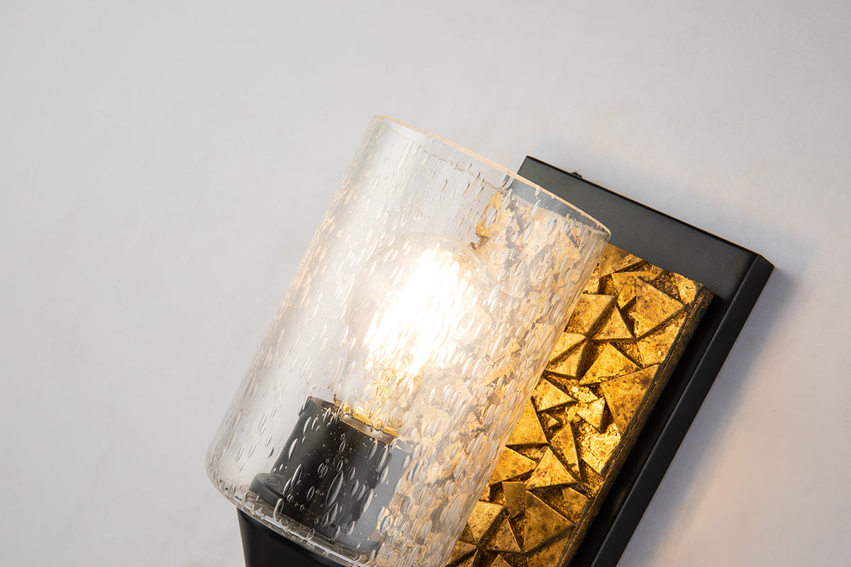 Perfect for brightening your hallway, bathroom or living space, this 1-light wall sconce features a clean-cut rectangle backplate with textured shapes, simple curved arm and a unique two toned finish of matte black and antiqued gold. Showing off its contemporary side, this one-light sconce uses a cylinder shaped clear seeded glass to bring attention to the mix of texture and detail that come together in our Bocage collection.