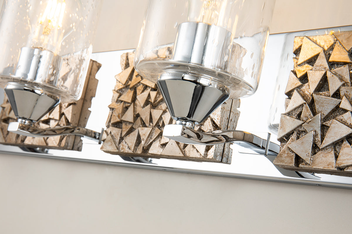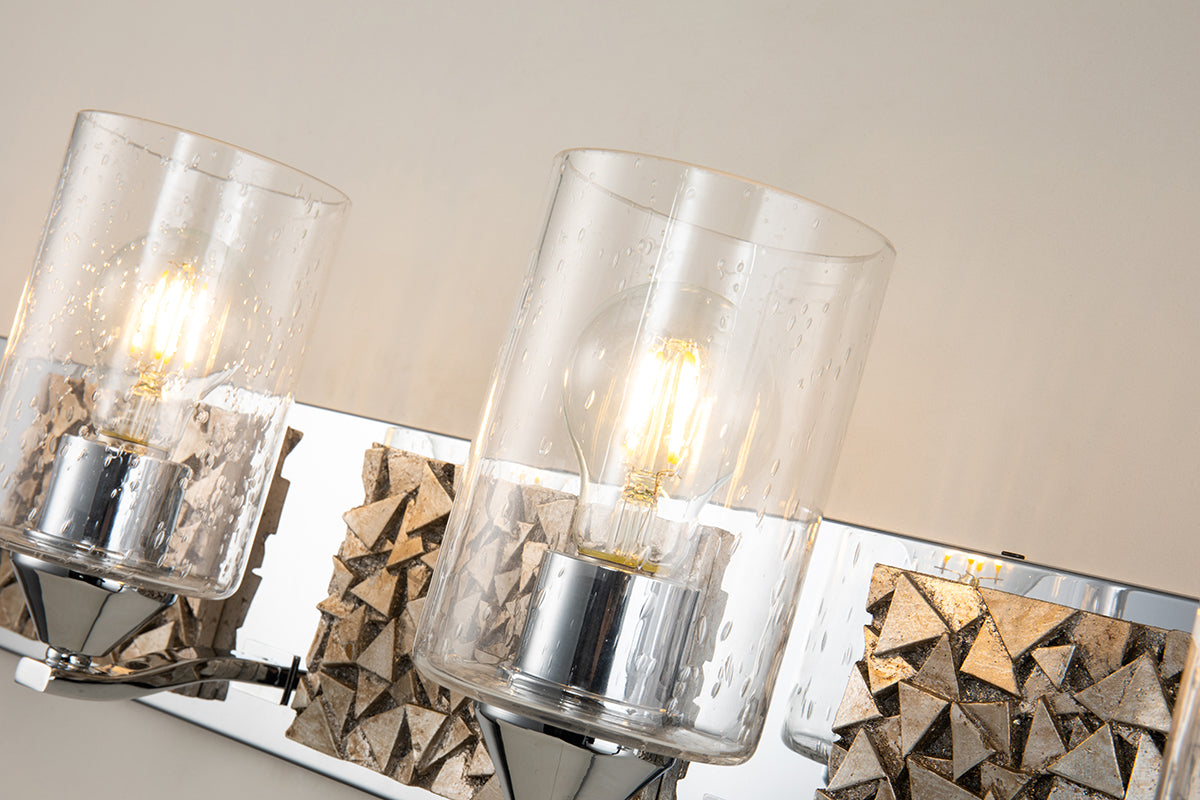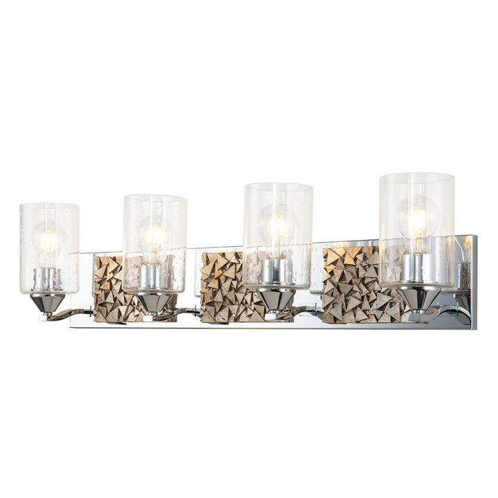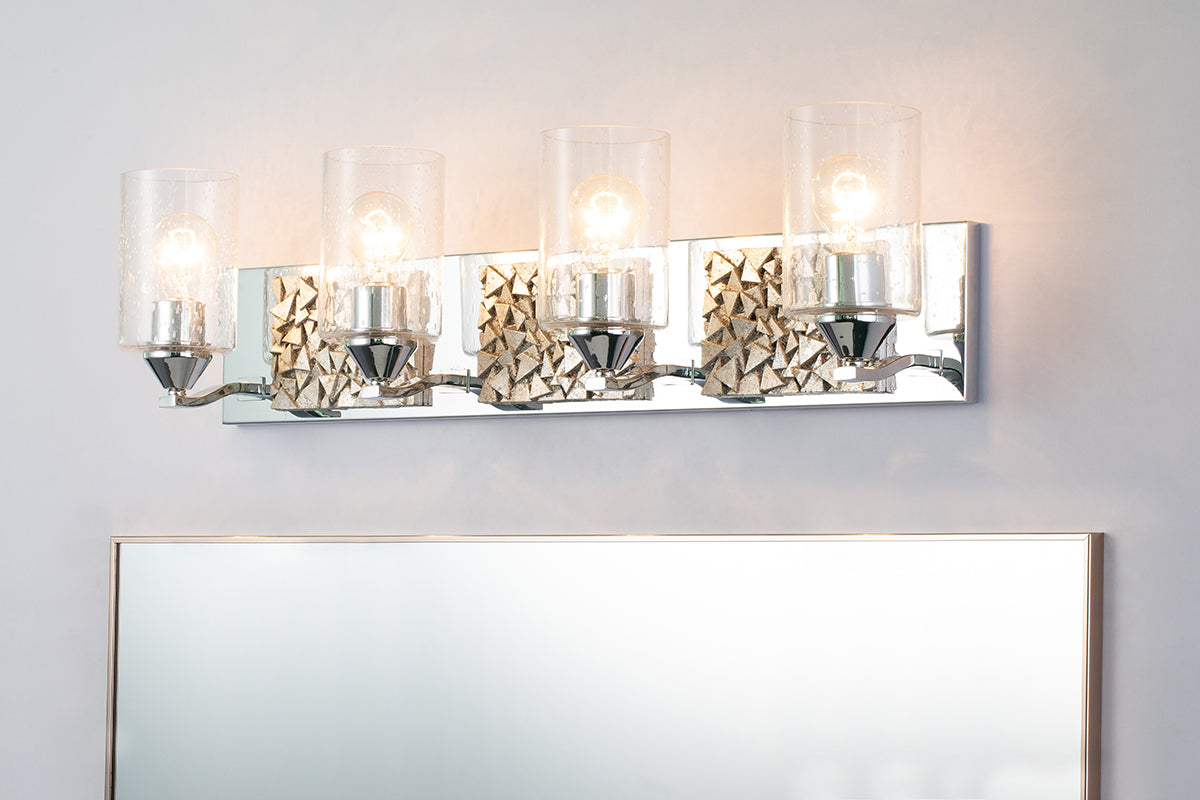 Clean lines and timeless design this 4-light vanity light is perfect for brightening your bathroom space giving it texture and dimension. Featuring a clean-cut rectangle backplate with textured traditional shapes, simple curved arm and a unique two-toned finish of polished chrome and antique silver. Showing off its contemporary side, this 4-light bathroom light uses a cylinder shaped clear seeded glass to bring attention to the mix of texture and details that come together in our Bocage collection. Measuring 35" Wide, 8" in height and 6.5" in depth, this four-light vanity light can fit in nearly any space.