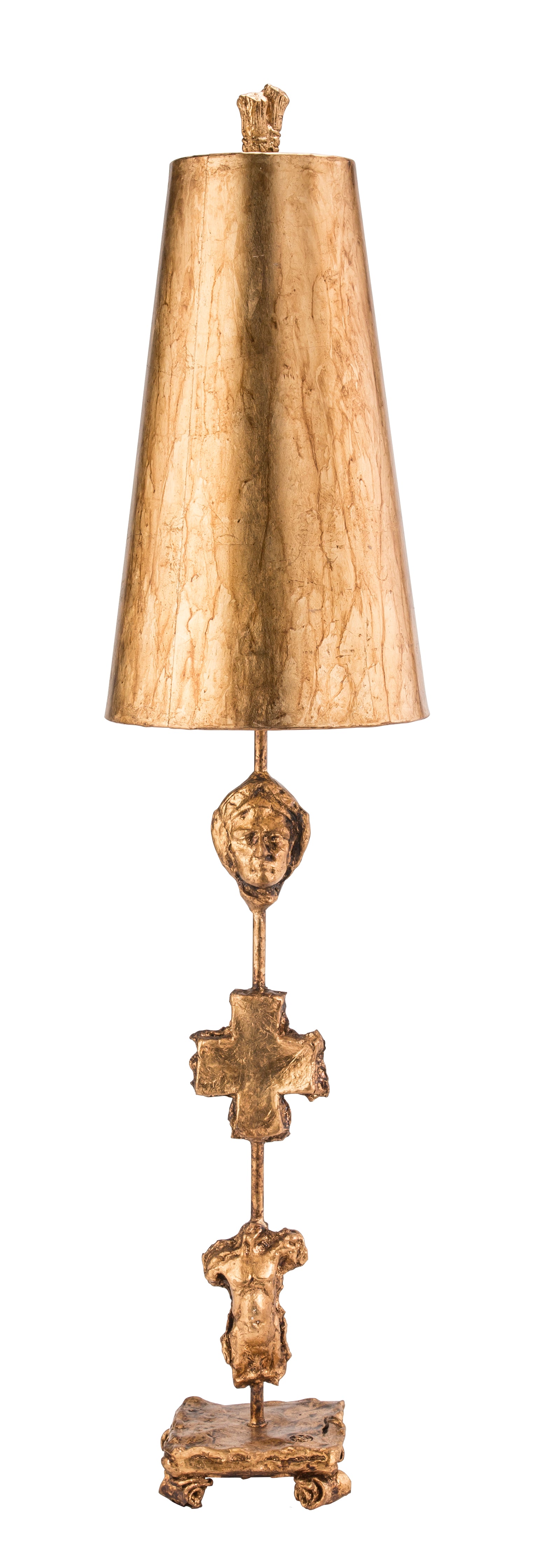 • Gold leaf lamp features molded silhouettes of a torso, cross and face cast from original pieces of ancient stonework fragments. Gold leaf linen shade.