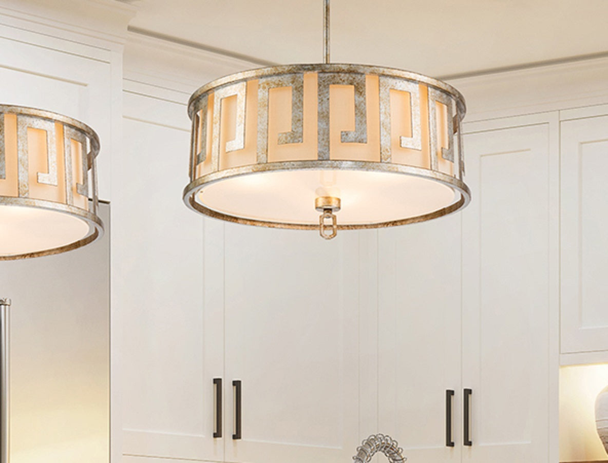 Our Flambeau inspired kitchen pendant is designed with a classic Greek key like metal outer drum with an ivory linen inner shade made into a hanging adjustable pendant creating a striking focal point. In the latest neutral tones of silver and cream, it is the perfect addition to your bedroom, kitchen, or over your bar. We finished this pendant with a white acrylic diffuser for soft light without the glare. Our Large Lemuria Pendant is shipped with extra stems for adjustable length, and can be installed as a semi-flush mount fixture for use in hallways and closets.