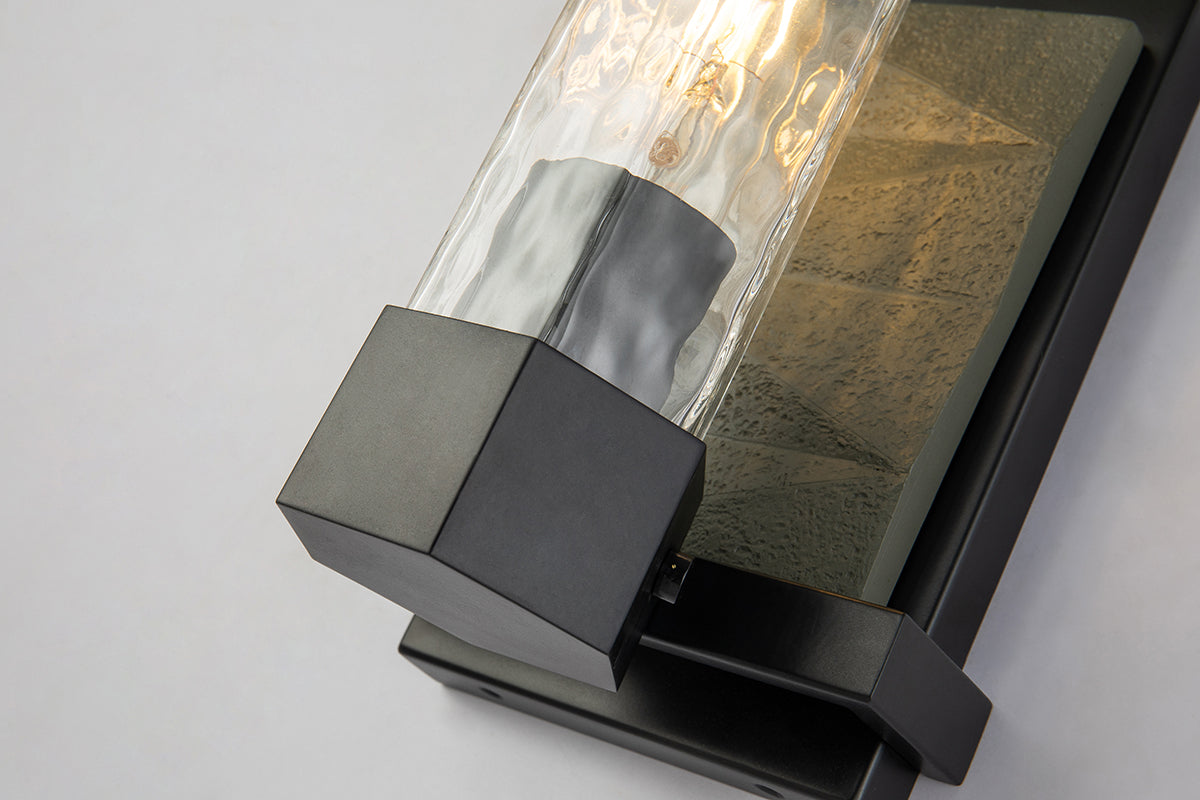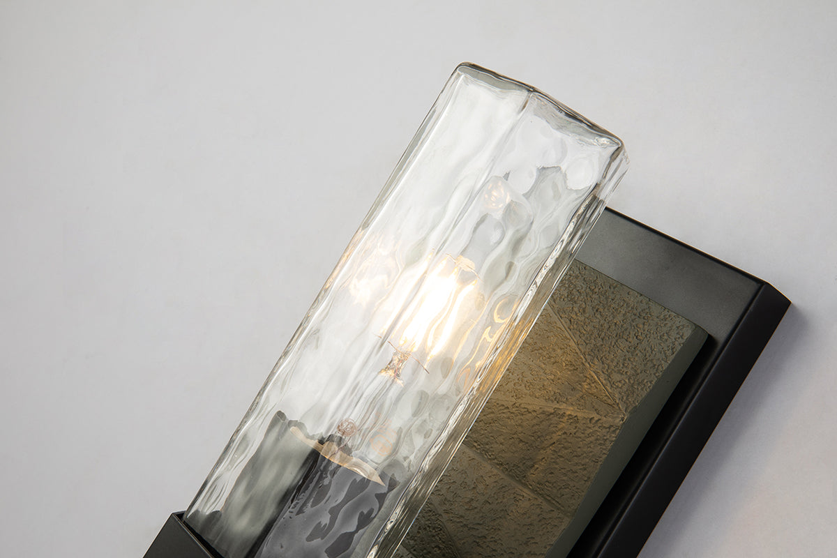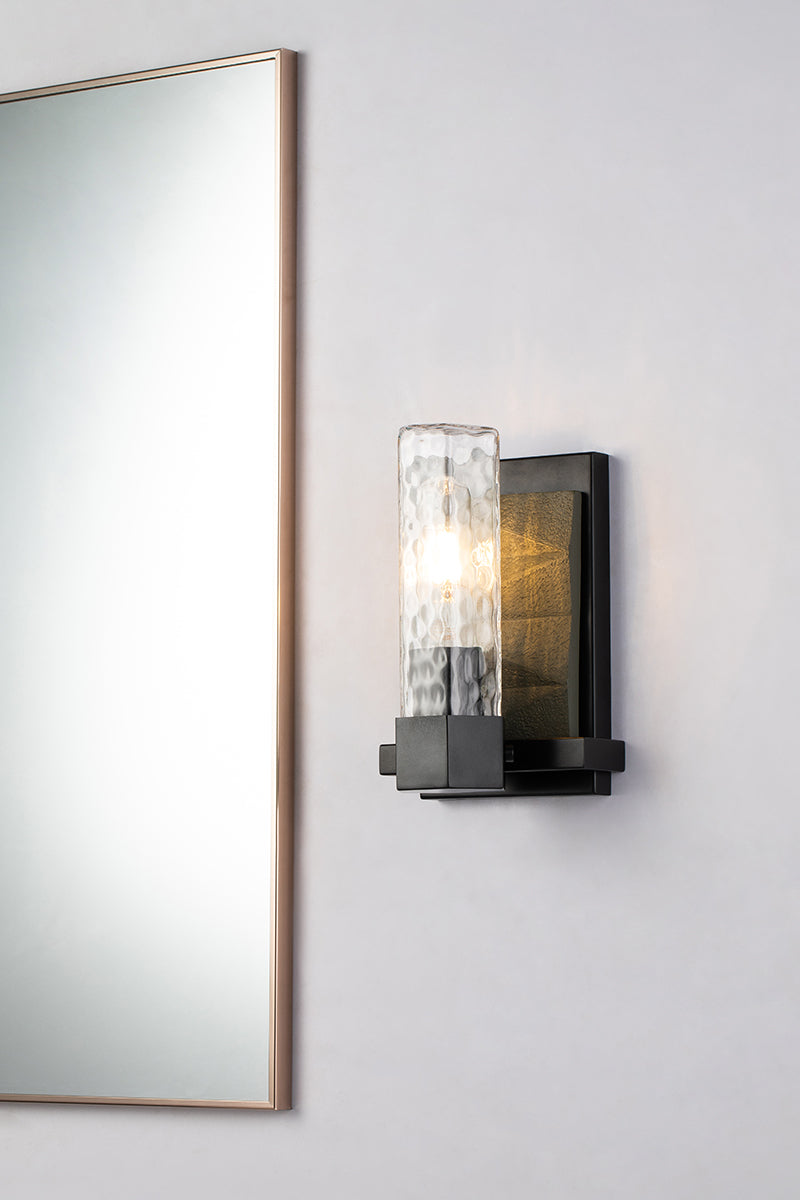 Charm guests with a warm contempory feel in your entryway or bring unique lighting into your hall or bathroom with this 1-light wall sconce. Suitable for damp spaces, this one-light sconce is crafted from metal and features a clean-lined wall mount rectangle shape that has grey textured shapes and is finished with a cylindrical, water glass shade and a forged metal black finish. Compact enough for any wall, this fixture measures 6" W x 9" H and 4.5" in depth.