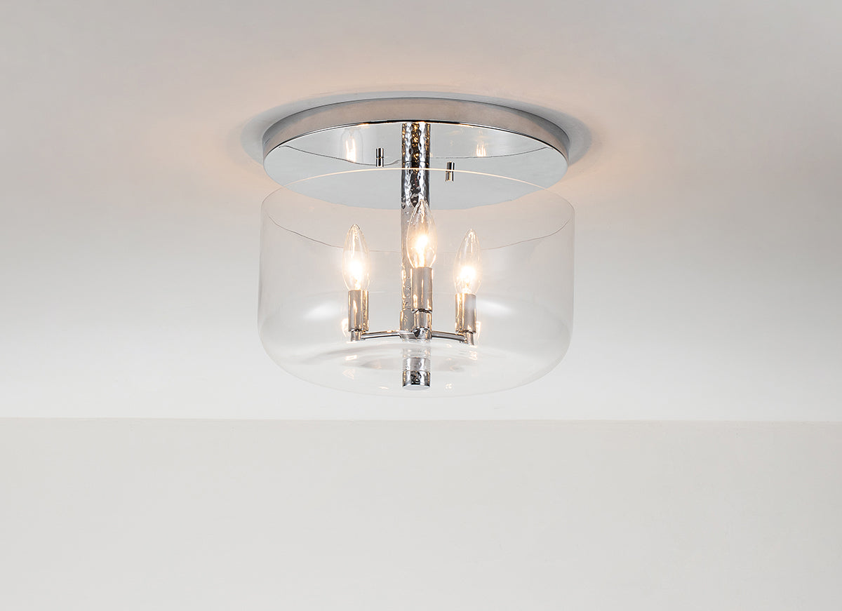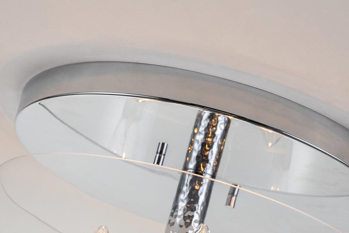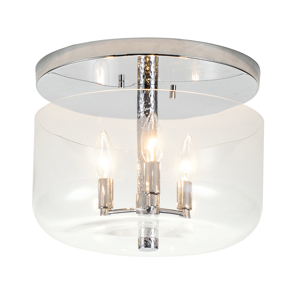 A contemporary design with a rustic appeal, this versatile semi-flush lighting fixture adds a modern touch in a minimalistic way. Strong and sophisticated lines are softened with the hammered center detail, and the clear, slightly curved glass gives off the perfect amount of light for beauty and function. With a 13 inches diameter and a 10 inch height, the Rampart semi-flush ceiling light is perfect for bathroom, kitchen or closet installation, and is finished in polished chrome.