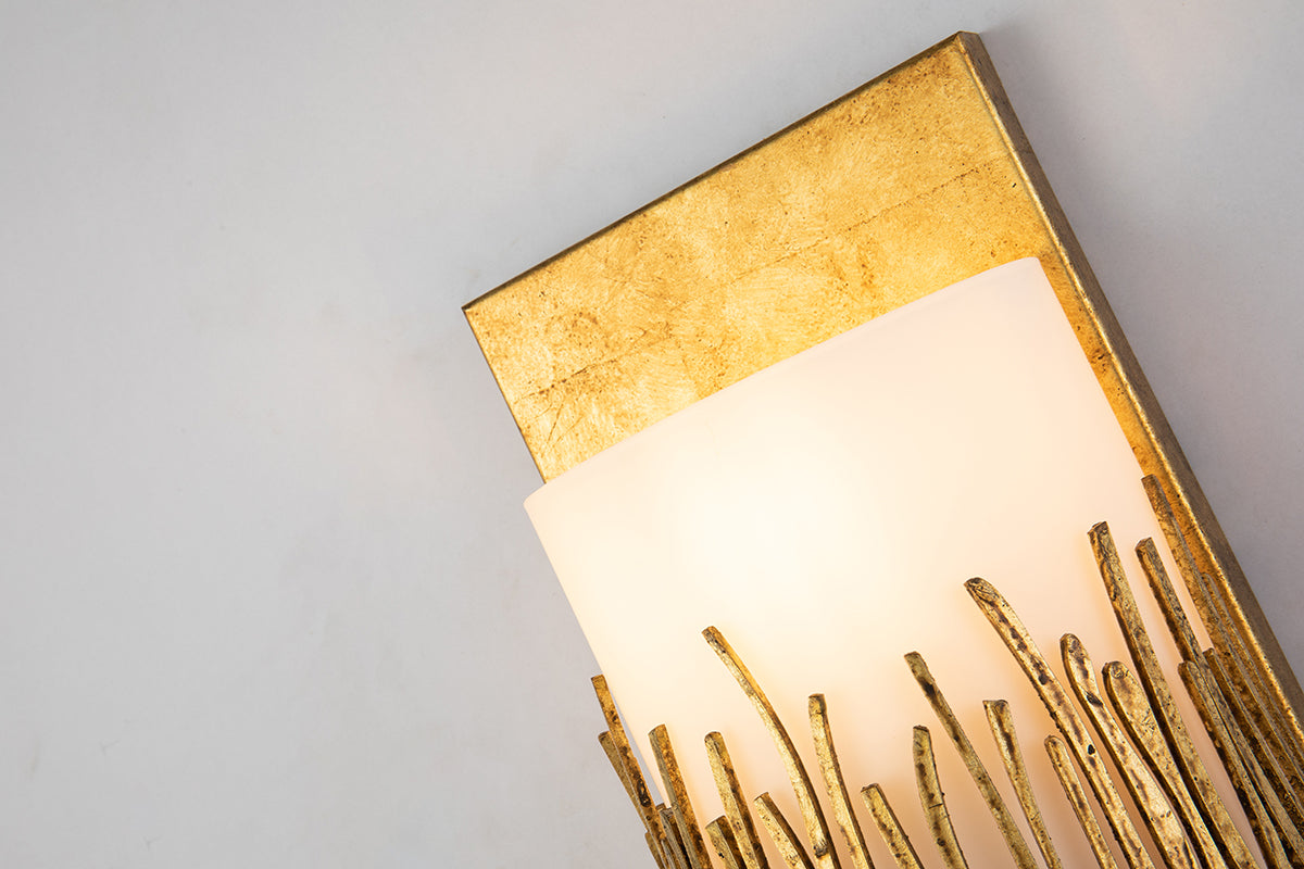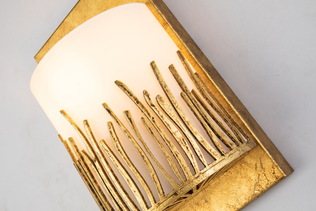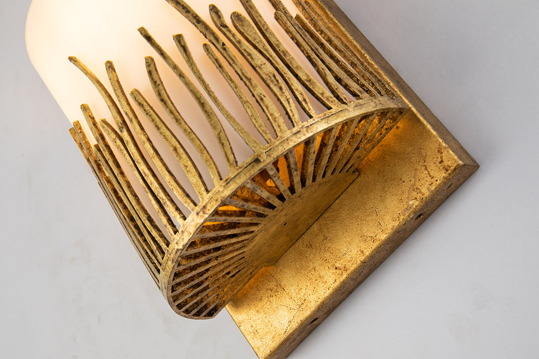 Find the light you love with this graceful and timeless gold leaf wall sconce. The relaxing and spa-like feel of this wall sconce, gives a beautiful silhouette that makes it the perfect choice to flank your bathroom mirror, place in your dining space or use in your favorite reading nook. The half drum piece of frosted glass sits perfectly in the gold grass-like holder allowing the perfect amount of light to flow into your space. Showing off our attention to details as the light beautifully shines through the bottom design as well as the grass-like shapes. Measuring 6" wide and 10" tall with a 4.5" depth, this wall sconce can be used in any space.