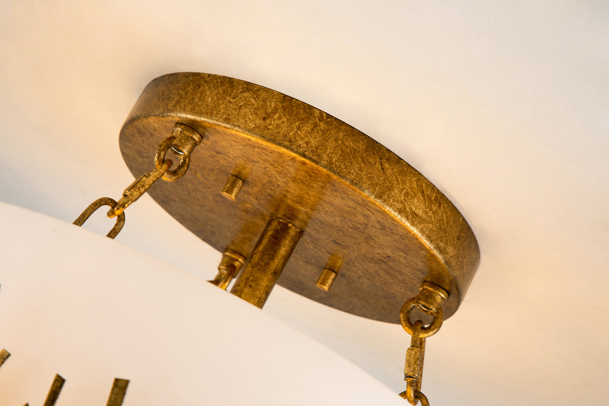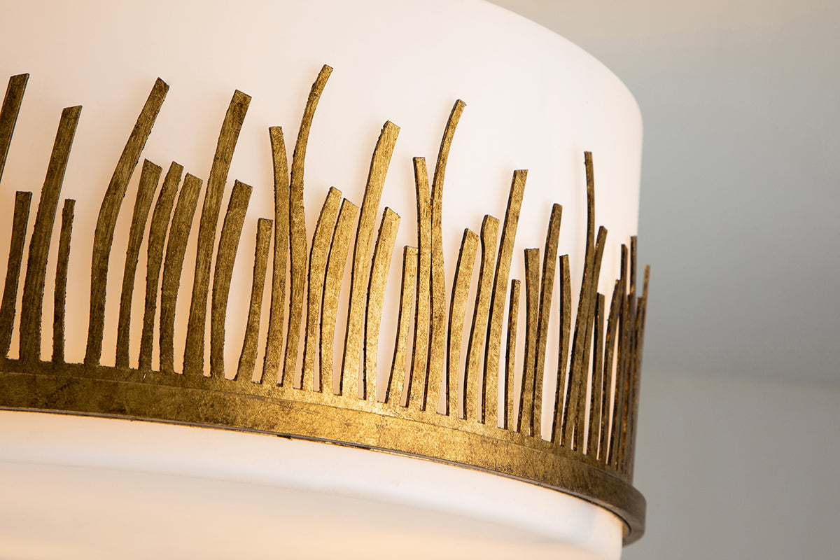 Find the light you love with this graceful and timeless gold leaf semi-flush ceiling light The relaxing and spa-like feel of this semi-flush light, gives a beautiful silhouette that makes it the perfect choice to show off in your bathroom, place in your dining space or use in your favorite reading nook. The frosted glass sits perfectly in the gold grass-like holder allowing the perfect amount of light to flow into your space. Showing off our attention to details as the light beautifully shines through the bottom design as well as the grass-like shapes. Measuring 15" in diameter and 11.5" in height, this ceiling light can be used in any space.