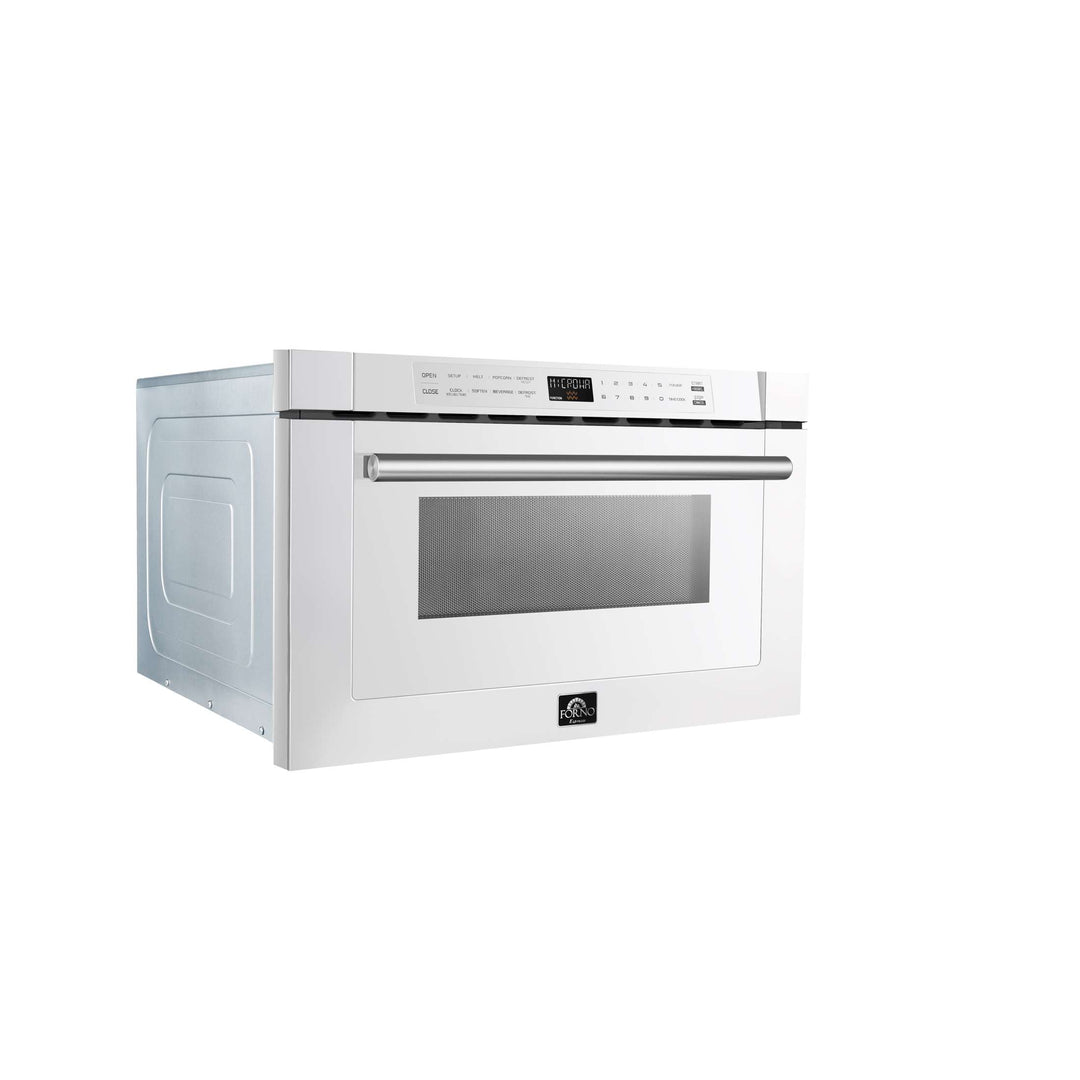 Upgrade your kitchen with the Forno Capolivera 24" Microwave Drawer, designed for effortless cooking. Featuring a 1.2 cu. ft. capacity, this white microwave with antique brass accents delivers 1,500 watts of power for fast, even heating—boiling water in just 1 minute and 50 seconds. With 11 power levels, you can precisely control cooking temperatures for everything from reheating to gourmet prep. Glass touch controls and an LED display offer a modern, user-friendly experience, while pre-programmed settings make it easy to melt butter, chocolate, and more. Enjoy versatile cooking modes, including defrost, popcorn, and beverage heating. The spacious interior accommodates 7-inch coffee mugs and 16 x 16-inch dishes, making it perfect for everyday use.