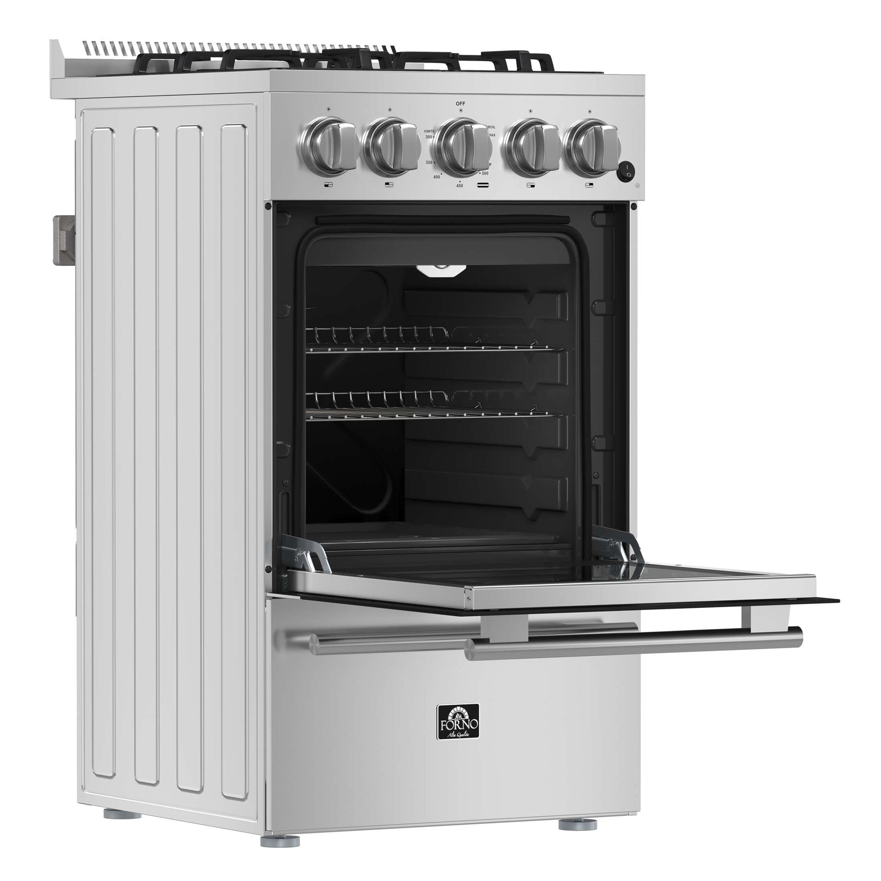 The Forno Lamazze 20 Inch Alta Qualita Pro-Style Freestanding Gas Range brings professional styling and Performance into your home kitchen with its durable stainless-steel design. Cooking Surface has with 4 sealed burners with a total output of 21,200 BTU and features continuous cast iron grates. The 20 Inch oven has a capacity of 2.05 cu. ft. with a combined broil and oven output of 13,000 BTUs and Internal cooling fan. Included are 2 electroplated oven racks, LP conversion kit and power cord. Ensure precision with your cooking using the unit’s thermostat and regulator. Additionally, zinc coated metal knobs with bezel rings will maintain their beauty for years.