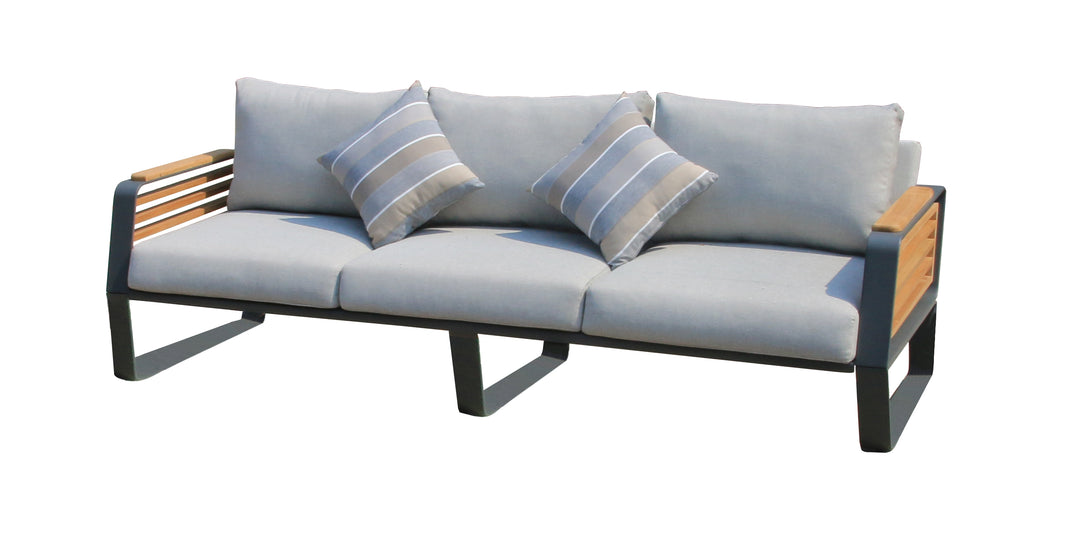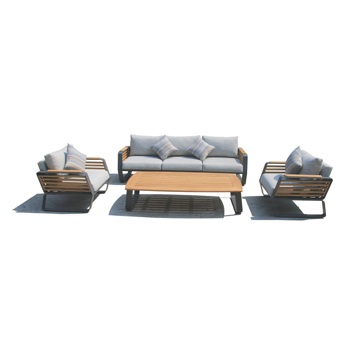 This beautiful Deko Living Palazzolo Outdoor Teak Patio and Coffee Table set will give your outdoor living space an elegant, natural look that’s sure to make your family and friends feel comfortable and welcome. Sofa chair cushioned pieces are quick dry foam covered in weather-resistant olefin fabric, constructed with high-quality powder coated aluminum frame structure and sustainably-sourced strong and dense teak hardwood, renowned for its durability, superior weather-resistance, this timeless furniture set is built to last through all seasons for years to come. Whether you’re entertaining guests or simply enjoying some quiet downtime in the sun, this set has everything you need for an unforgettable experience.