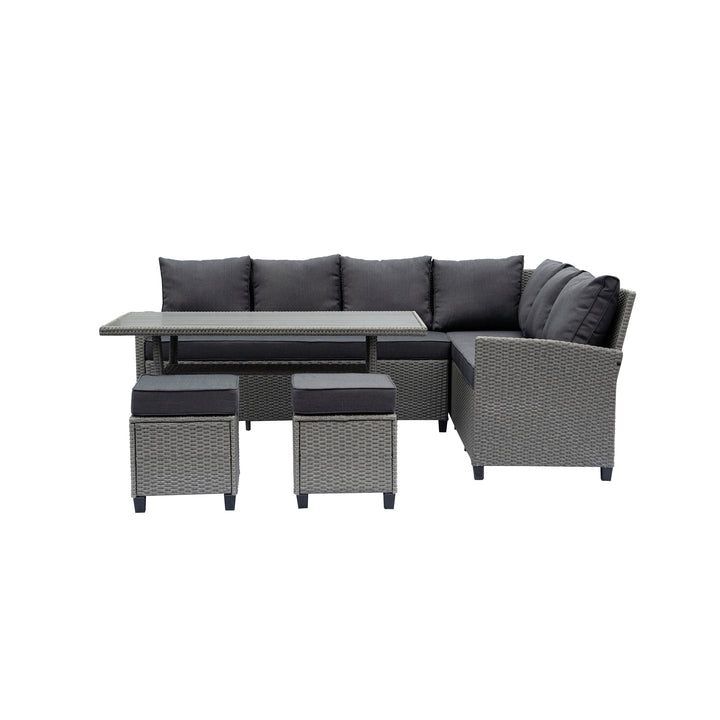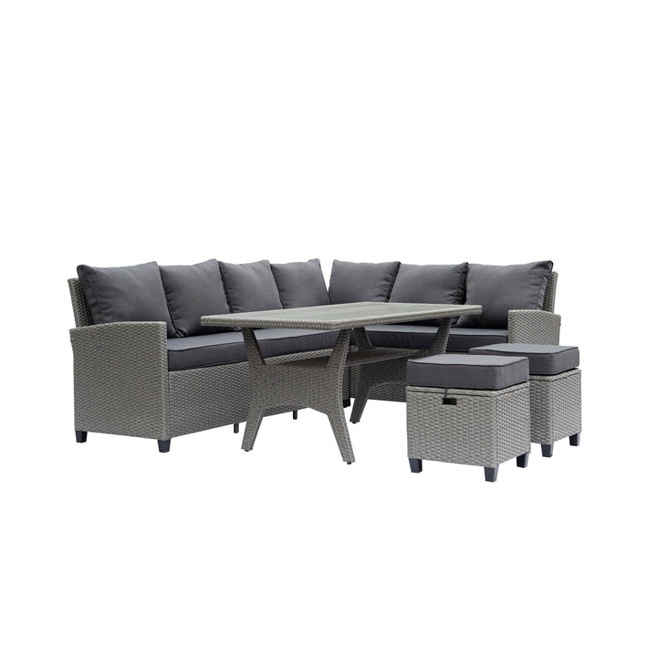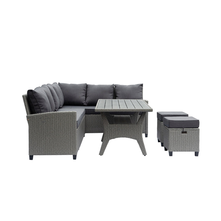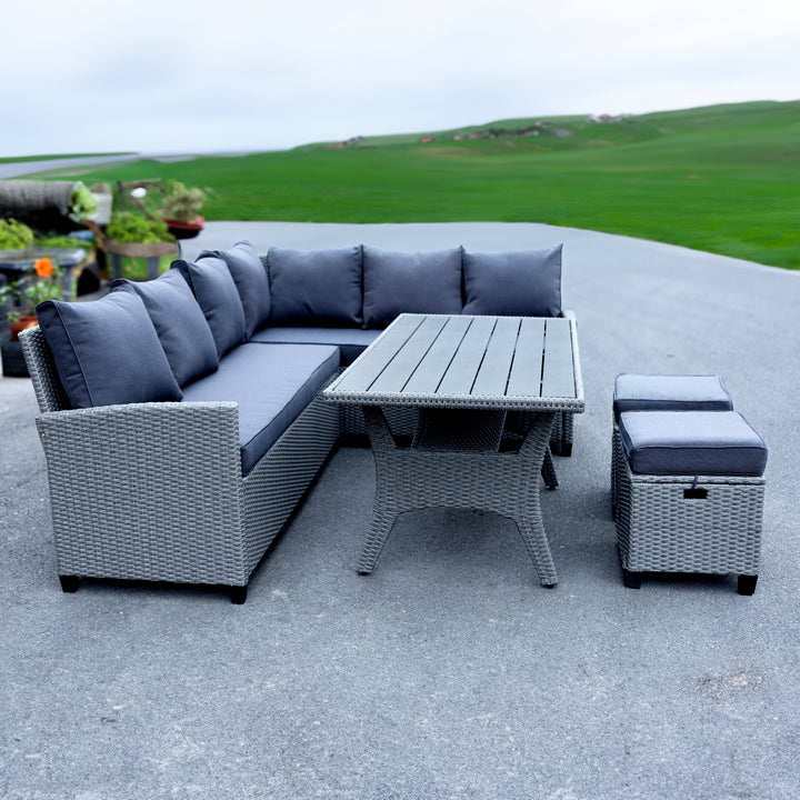 Introducing our Outdoor Wicker Sectional Sofa & Ottoman Set with Table – a stylish and versatile ensemble designed for comfort and durability in any outdoor setting. Enjoy the beauty of wicker combined with the resilience of a powder-coated frame, polyester material, polyurethane cushions, and all-weather resistance. Transform your outdoor living space into a haven of comfort and style, whether you're hosting gatherings or savoring quiet moments outdoors, this set provides the perfect combination of durability, comfort, and versatility