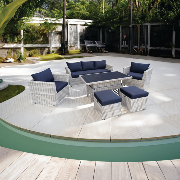 Introducing our Outdoor Wicker Sofa & Ottoman Set with Adjustable Coffee/Dining Table – a versatile and stylish ensemble designed to elevate your outdoor living space. Enjoy the perfect combination of comfort and functionality with a powder-coated frame, polyester material, polyurethane cushions, and all-weather resistance. Upgrade your outdoor area with the perfect combination of comfort and functionality, whether you're hosting gatherings, enjoying quiet moments, or dining al fresco, this ensemble provides an elevated outdoor experience that complements the beauty of your surroundings.