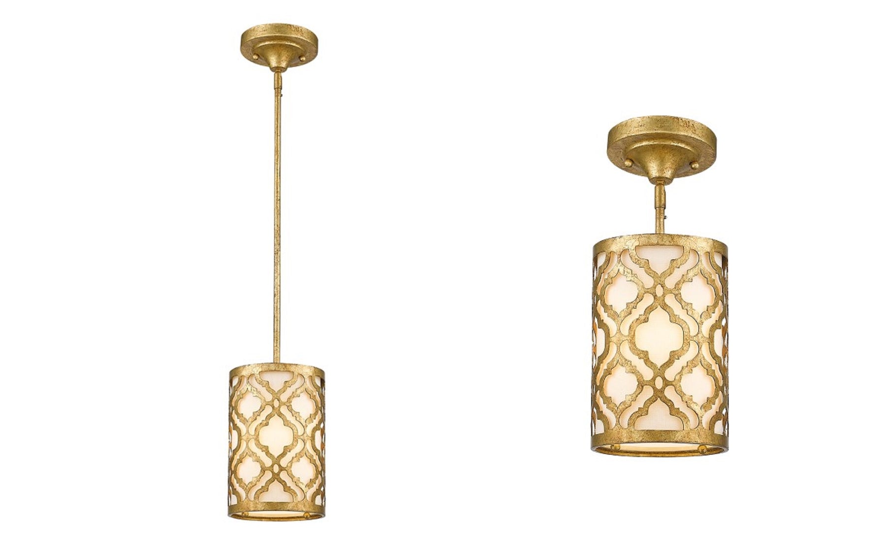 Crafted from our unique metal design, this piece features an outer shade with an openwork trellis like pattern and distressed gold finish with an interior fabric drum shade. This kitchen pendant accommodates a single light, and the medium based bulb can be purchased separately. Setting the mood by adjusting the ambiance, is one of our favorite features.