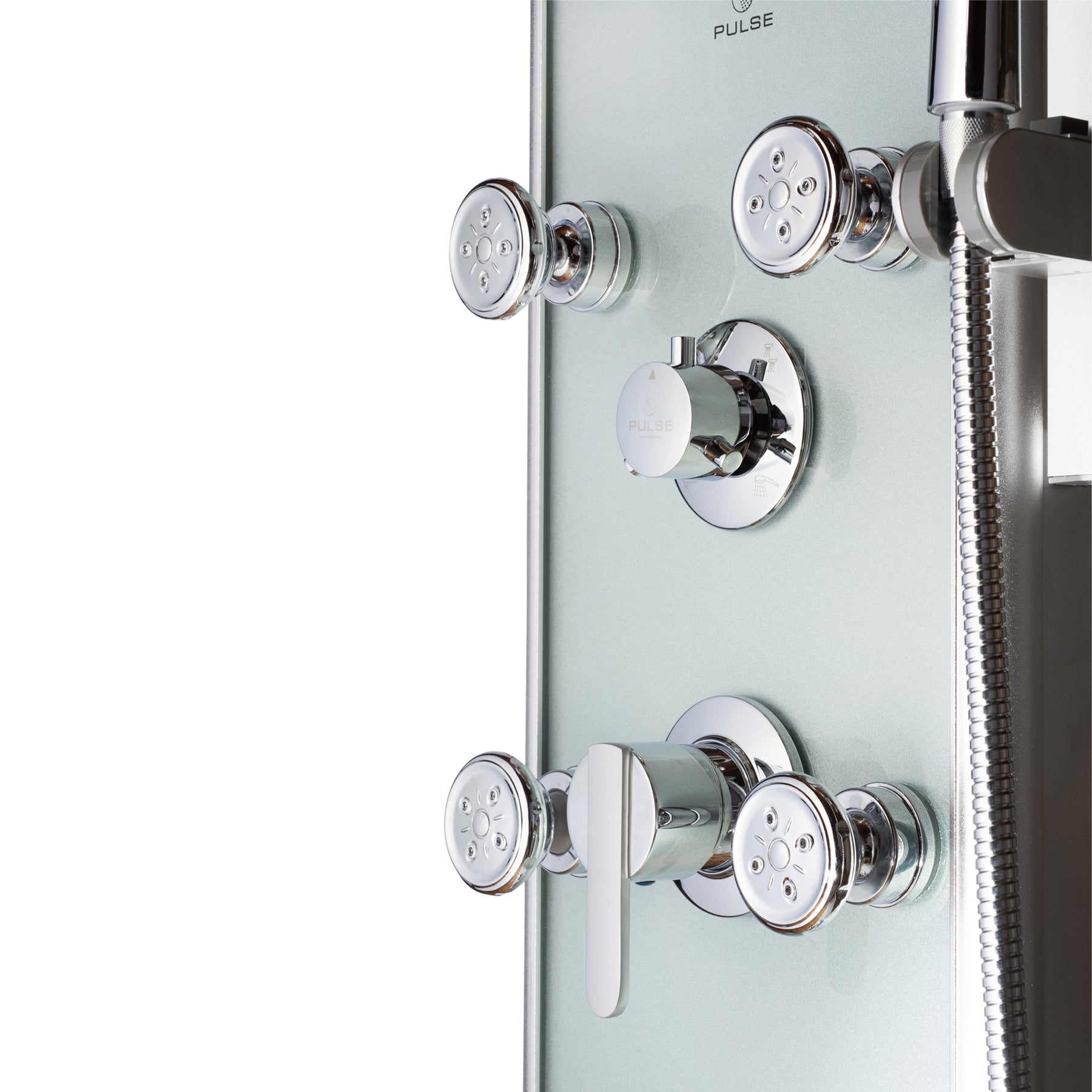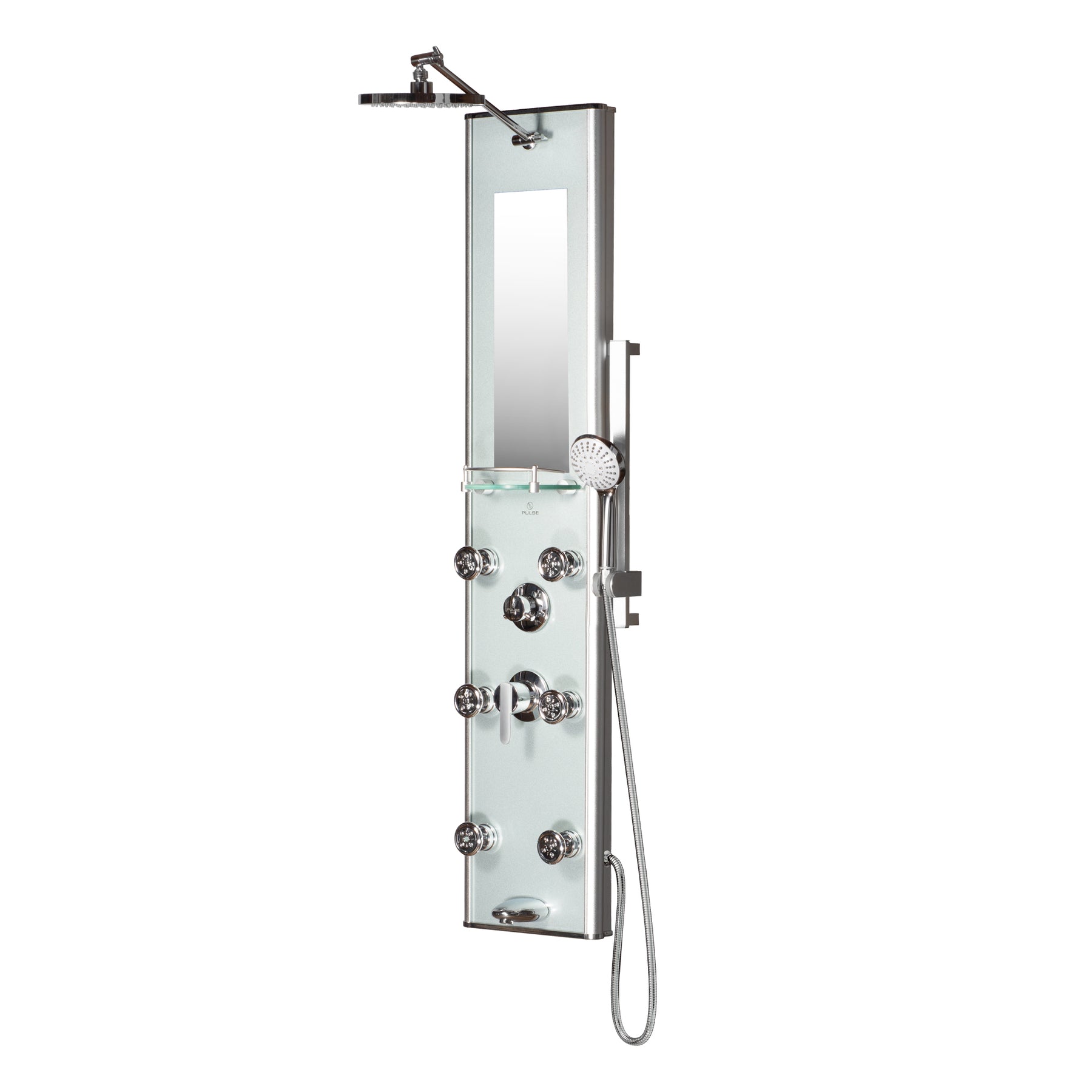 The Kihei II ShowerSpa boldly transforms any shower! The sleek, metallic silver Tough Glass set between anodized aluminum rails with a built-in mirror and glass shelf is as versatile as it is stylish. Enjoy the relaxing rain showerhead, 6 invigorating body jets, a five-function handshower, and tub spout. Easily accommodate different heights with the articulating brass shower arm. Select-A-Jetâ„¢ allows you to selectively turn off the lower jets, increasing pressure to just the right areas. Form, function, and fun are brought harmoniously together with the Kihei II ShowerSpa.