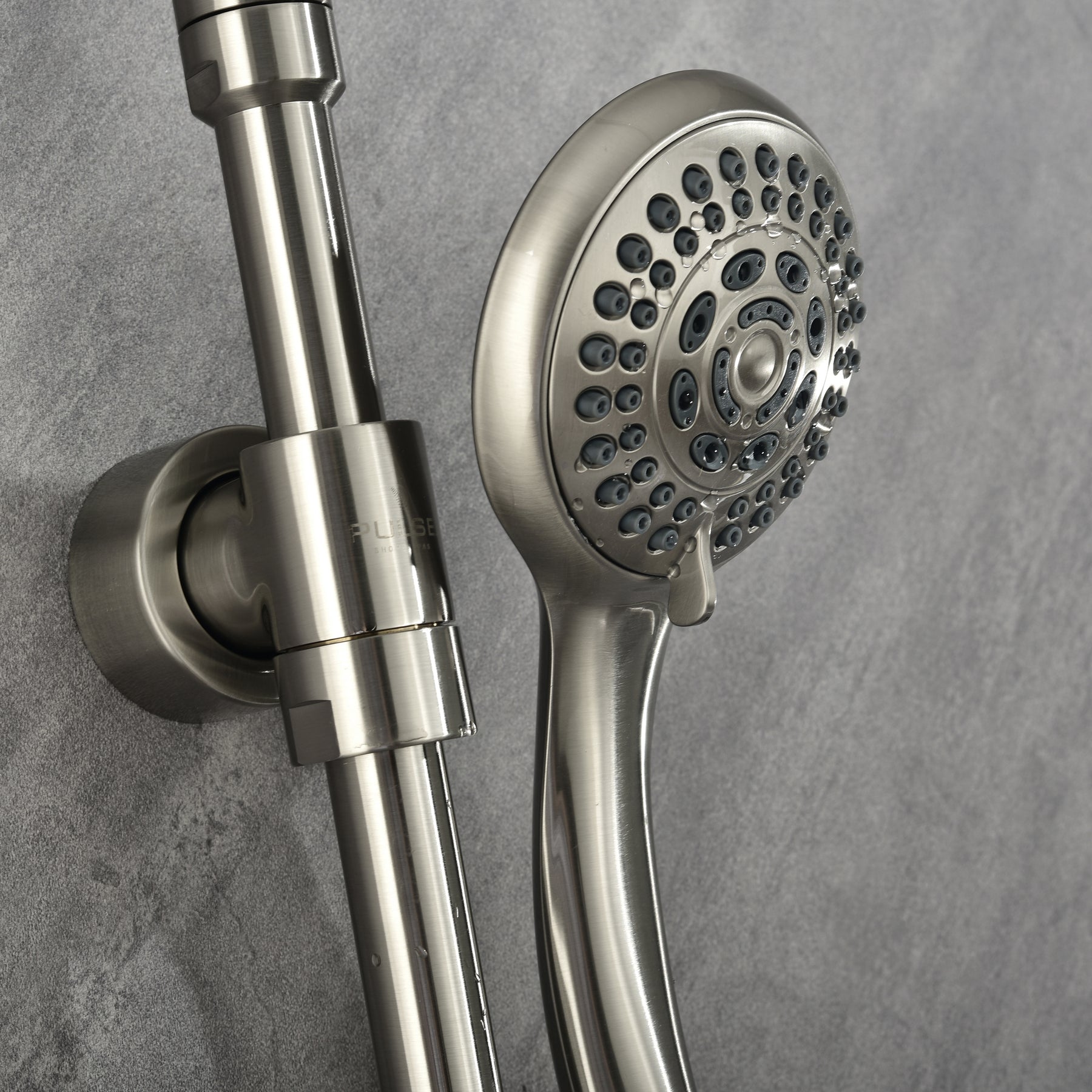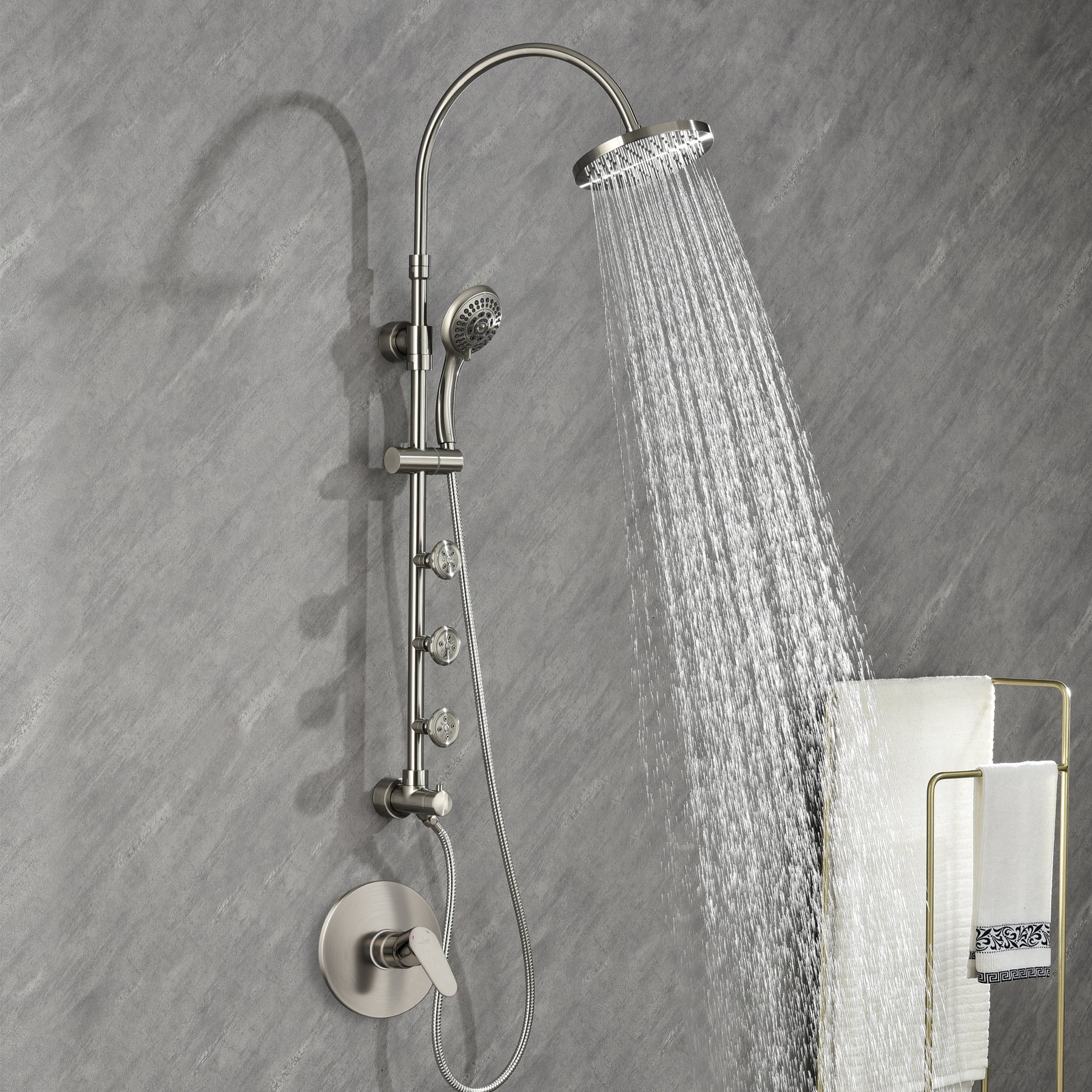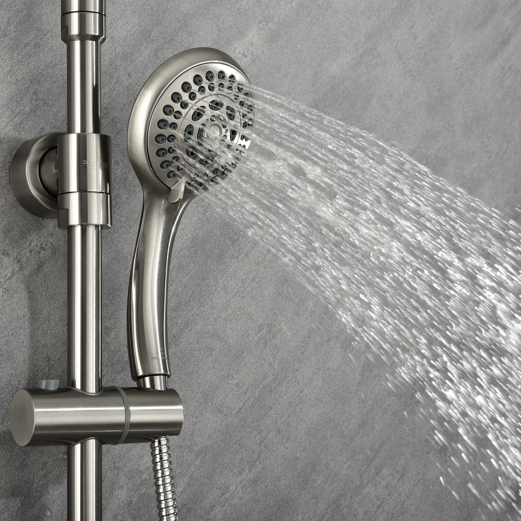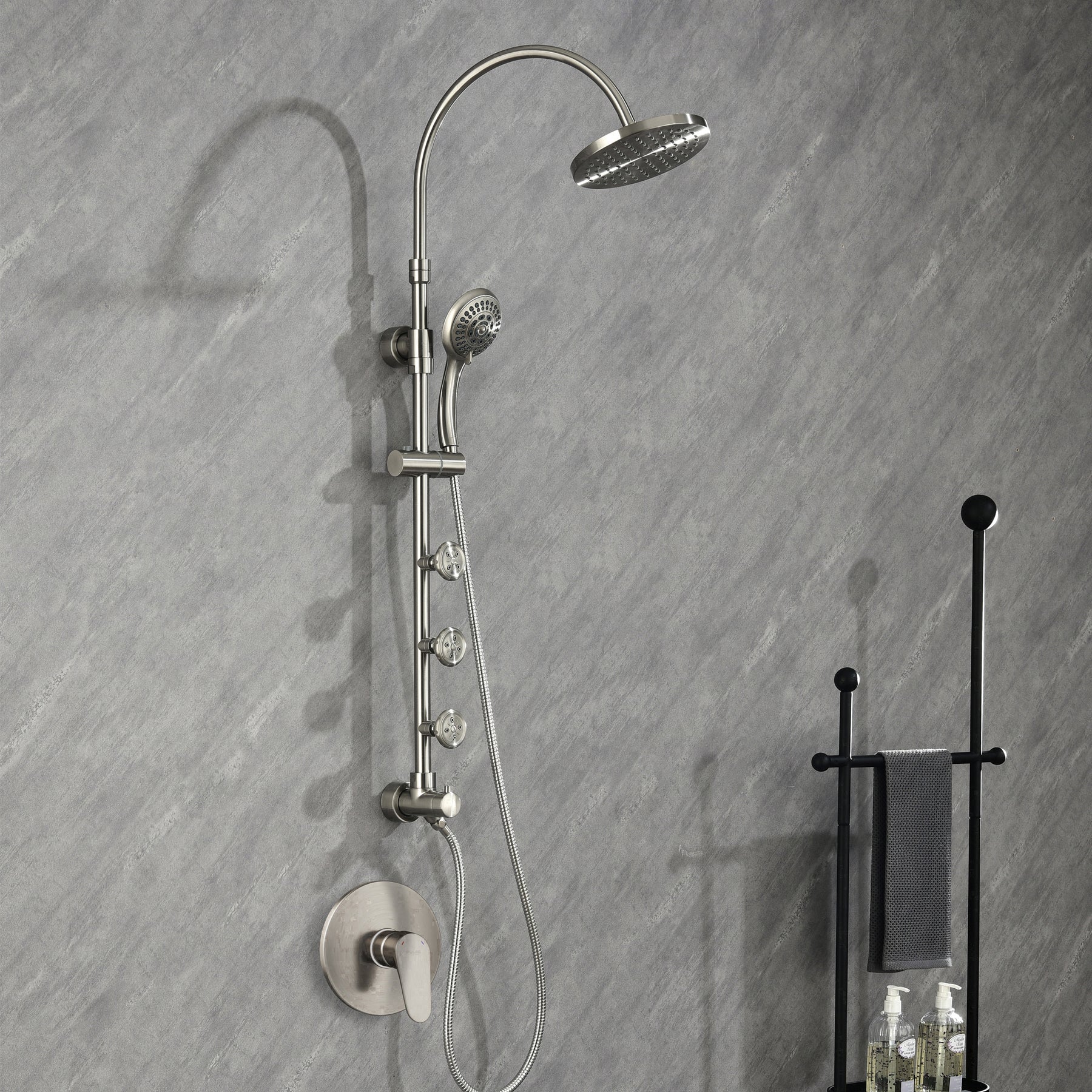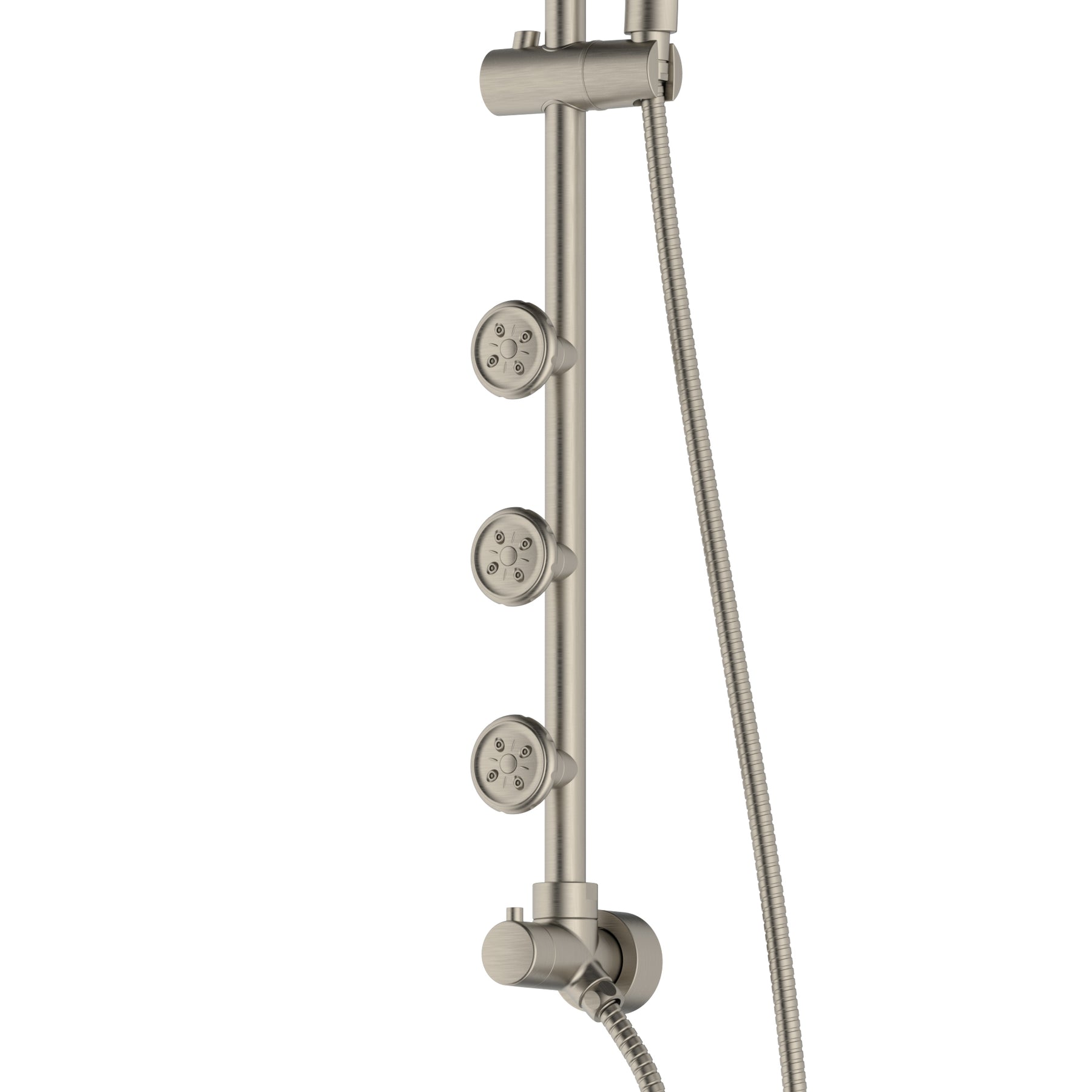 The Riviera Shower System includes three multi-function body jets with on/off capability, 8-inch rain showerhead, five-function handshower, slide bar, and is made of brass and ABS construction.