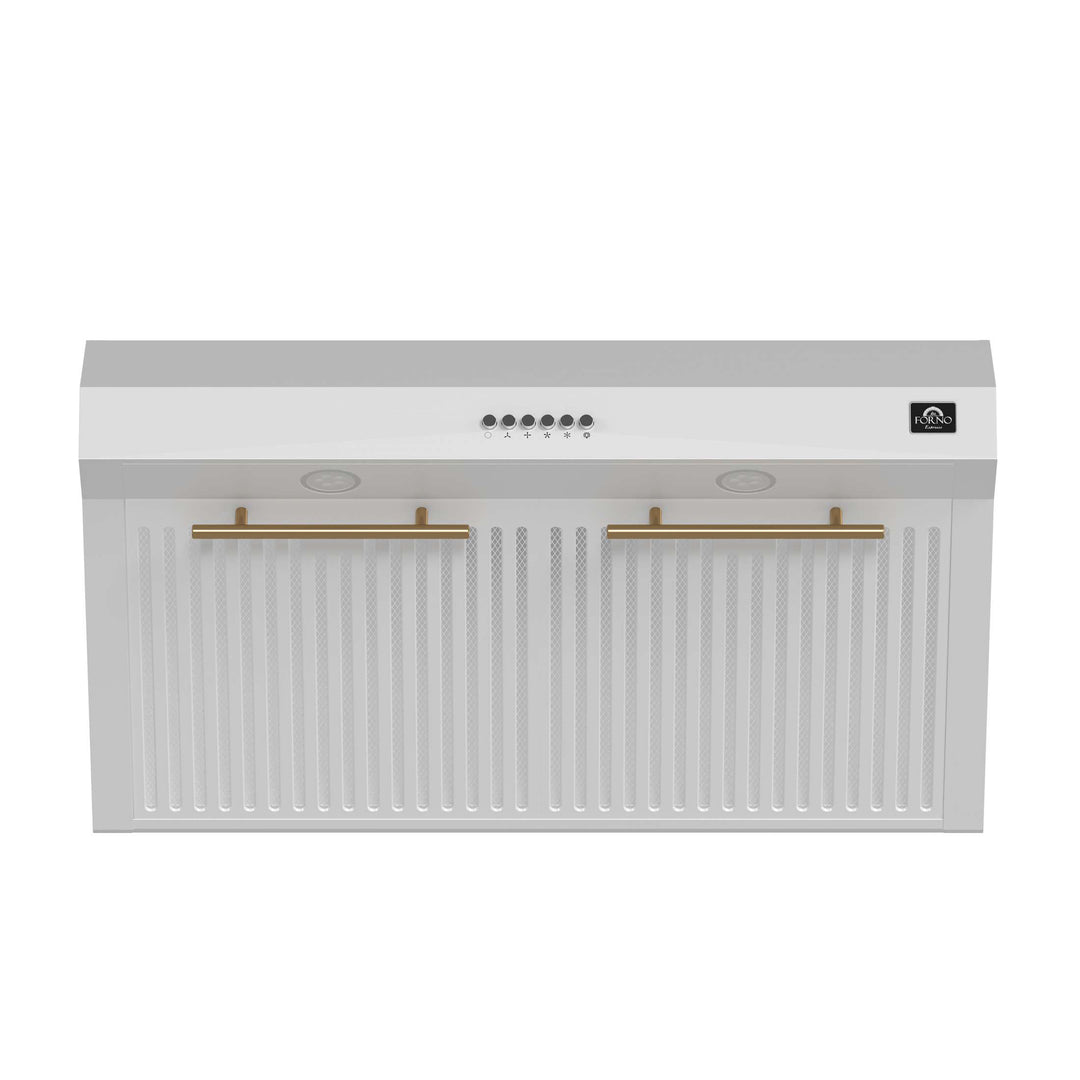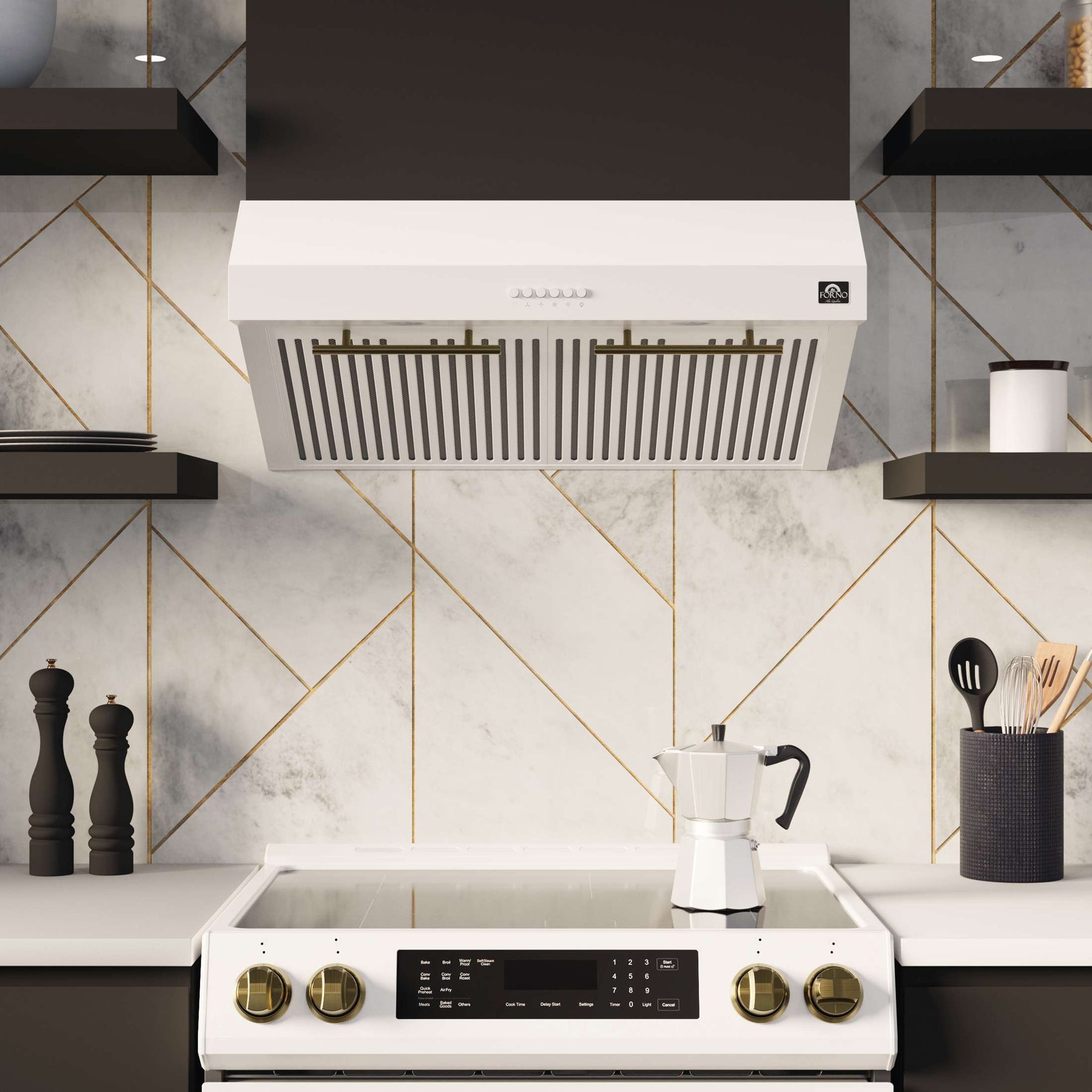 Forno presents the Bari 30 Inch Espresso Range Hood, an exceptional under cabinet range hood that boasts an elegant white finish, adding a touch of sophistication to your kitchen space. With its powerful 400 CFM airflow, this range hood efficiently eliminates cooking odours, smoke, and airborne grease, ensuring a fresh and clean environment. The user-friendly 4 speed push button control allows you to adjust the ventilation settings effortlessly, providing optimal performance tailored to your needs. Illuminate your cooking area with two built-in LED surface lights, offering bright and even lighting for a delightful culinary experience. Equipped with a durable hybrid filters, this range hood effectively traps grease and debris, ensuring easy maintenance and prolonging the lifespan of the appliance. Choose between the provided antique brass or stainless steel handles to customize the filters. Upgrade your kitchen with the versatile and high-performing under cabinet range hood from Forno, where style meets functionality.