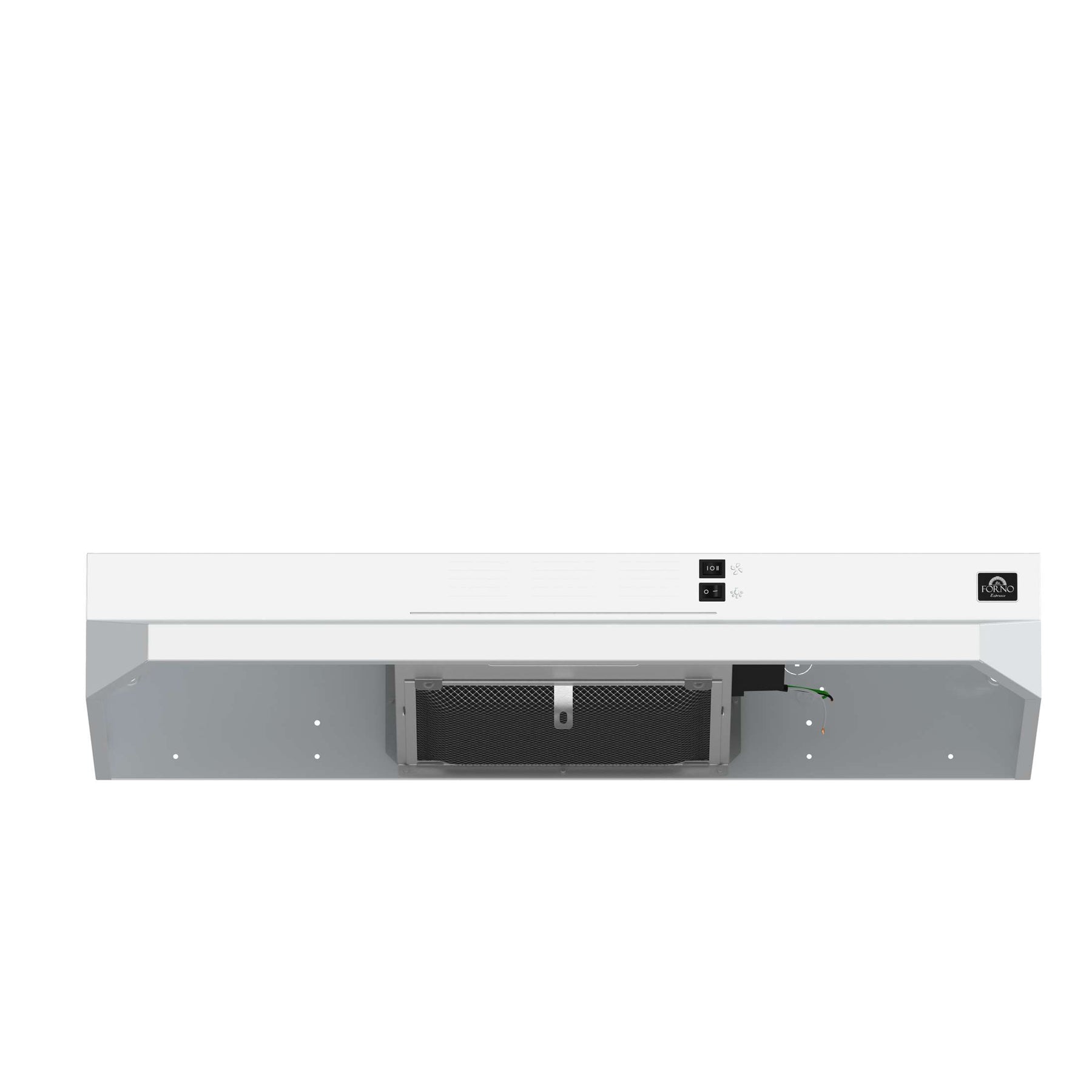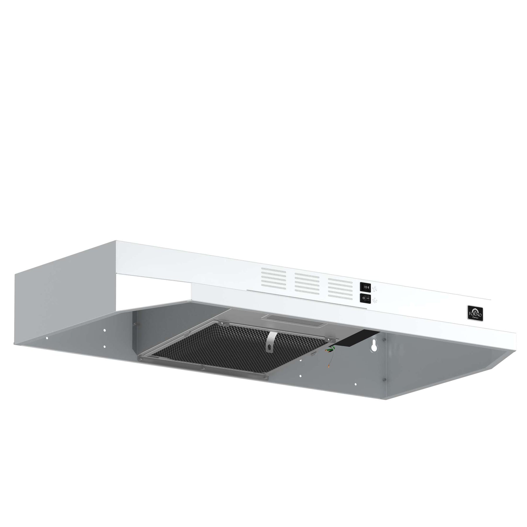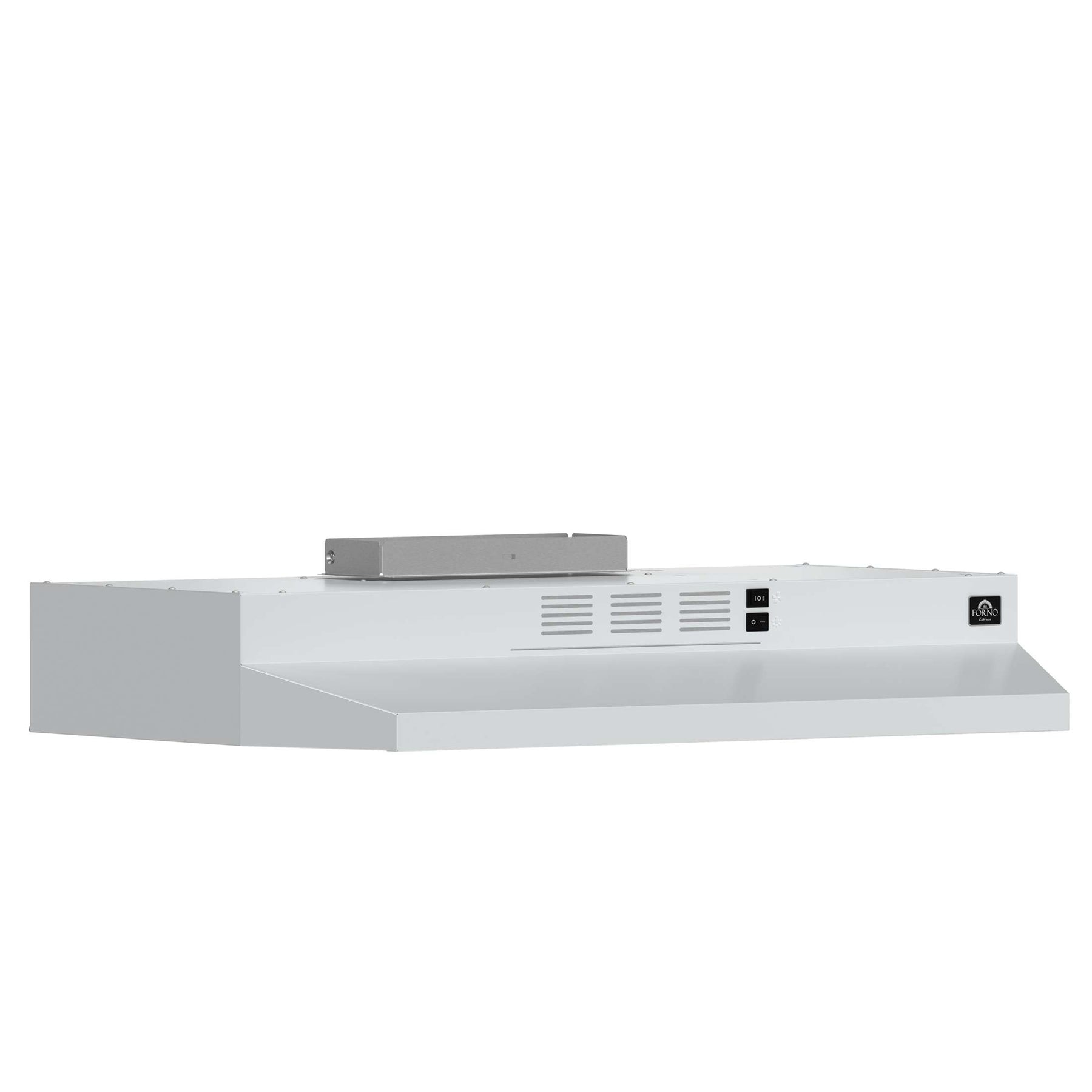 Upgrade your kitchen with the Forno Cappa 30" Under Cabinet Range Hood in white, designed for efficient ventilation in compact spaces. With its ultra-slim 4.7" height seamlessly fits under cabinets, making it perfect for small kitchens and apartments. Equipped with a 2-speed exhaust fan, this range hood effectively removes smoke, grease, and odors while maintaining a quiet operation at just 54 dB. Enjoy versatile installation with ducted or ductless options, plus dishwasher-safe aluminum mesh filters and a carbon filter for superior air purification. Bright 2W LED lights provide energy-efficient illumination, ensuring a well-lit cooking space. Easy-to-use mechanical controls allow effortless adjustments for customized ventilation.