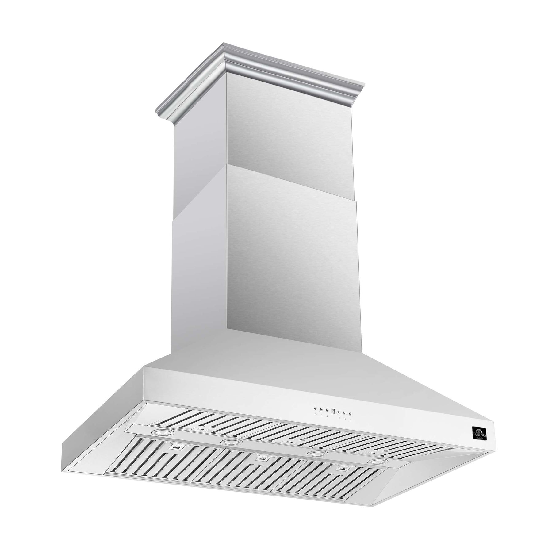 The Coppito 48" Stainless Steel Island Range Hood delivers powerful ventilation with a 1200 CFM motor and four-speed push-button controls, effectively removing smoke, odors, and airborne grease. Designed for modern kitchens, its high-grade stainless steel construction offers lasting durability and a sleek finish, enhanced by decorative crown molding. Engineered with noise-reduction technology, it ensures quieter operation during use. Built-in surface lights provide bright, energy-efficient illumination over your cooktop. Dishwasher-safe stainless steel baffle filters trap grease and contaminants for cleaner air and easy maintenance.
