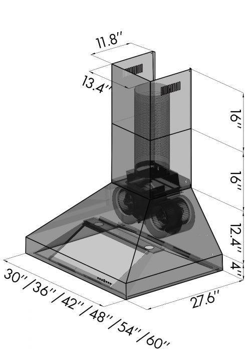 | Chimney (Dimension): | 13.5" W x 11.75" D x 16" H (x2) (Telescoping) Chimney Short Kit and Extension(s) Available: Short Kit (2-12") ~7-8 ft. Ceilings 1 PC Extension (1-36" + 1-16") ~9-10 ft. Ceilings 2 PC Extension (2-36") ~10-12 ft. Ceilings |