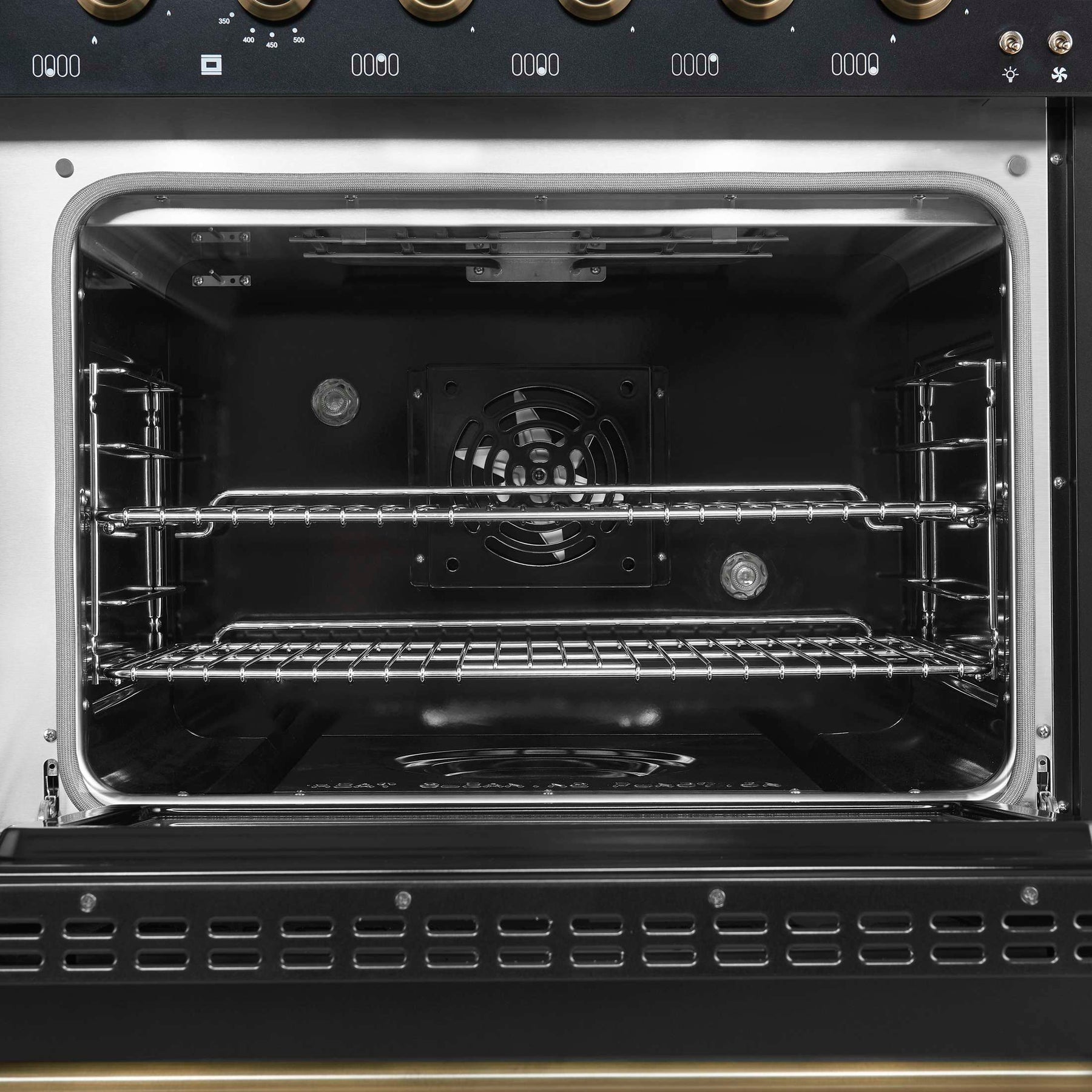 Bring style and power to your kitchen with the Forno Antico 48" Dual Fuel Range in black—where elegance meets exceptional performance. With 8 sealed burners and a total output of 94,000 BTU, it delivers the power and precision needed for any culinary challenge. The two dual-ring brass burners provide up to 20,000 BTU for high-heat searing and 1,000 BTU for simmering, delivering exceptional control. Its 3.5 cu.ft. convection oven and an additional 2 cu.ft. oven provides ample room for big family meals. The sleek black finish with antique brass accents exudes sophistication, while cast-iron grates ensure stability and durability, and recessed enamel cooktop makes cleanup effortless. This range seamlessly blends power, style, and dependable performance for an exceptional cooking experience all at an affordable price.
