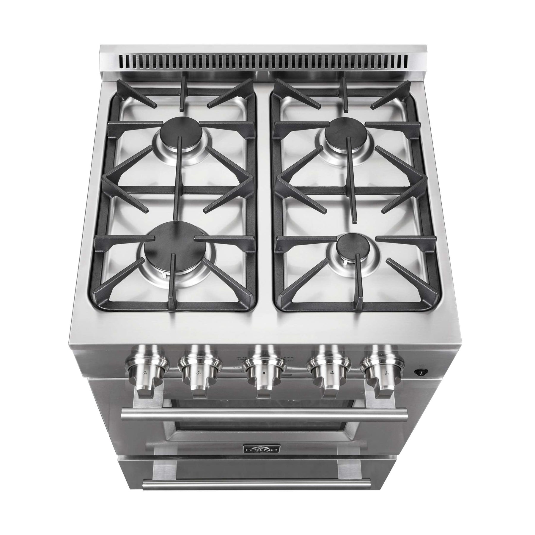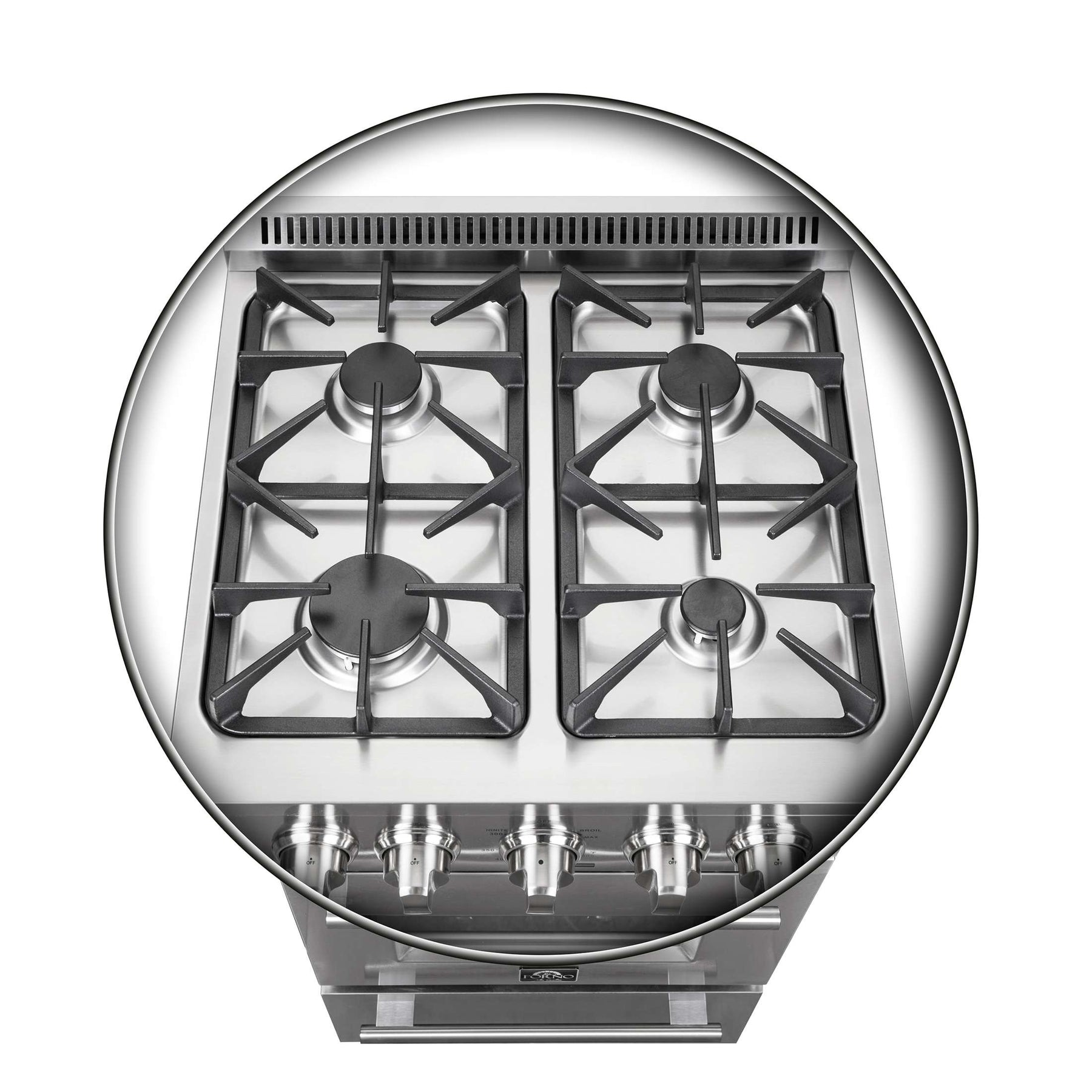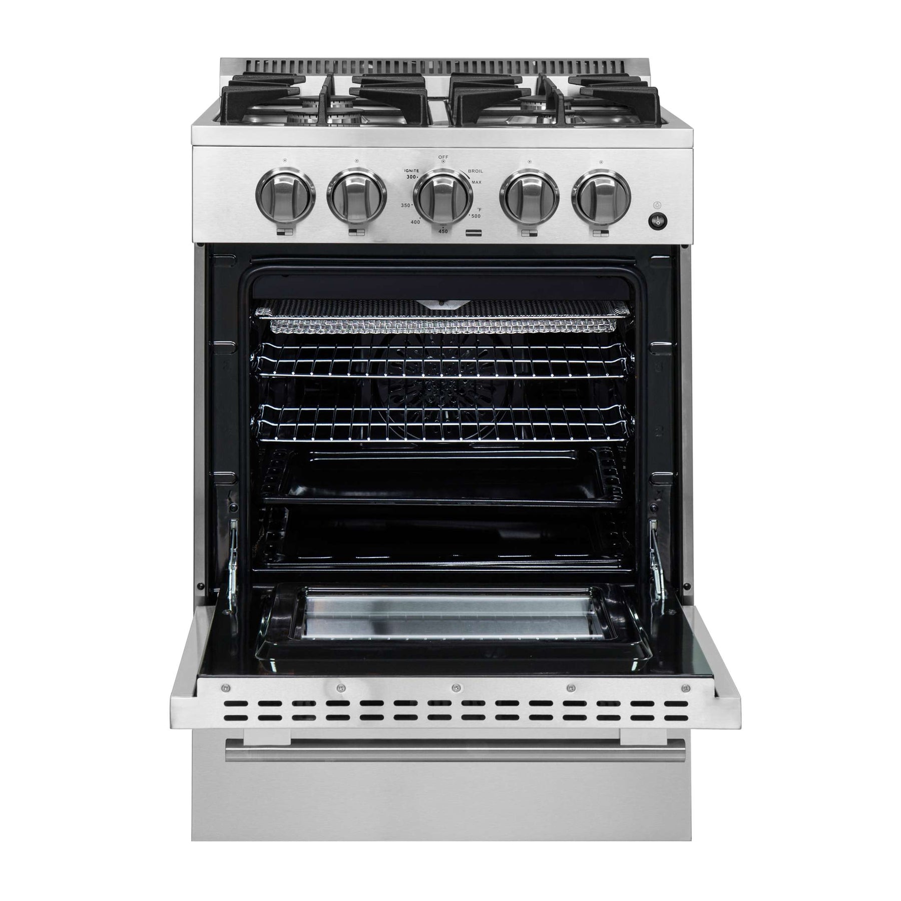 The Forno Breno 24 Inch Alta Qualita Pro-Style Freestanding Gas Range brings professional styling and Performance into your home kitchen with its durable stainless-steel design. Cooking Surface has with 4 sealed burners with a total output of 38,000 BTU and features continuous cast iron grates. The convection oven has a capacity of 2.3 cu. ft. with a combined broil and oven output of 13,000 BTU. Included are 2 electroplated oven racks, LP conversion kit and air-fryer kit. Additionally, zinc coated metal knobs with bezel rings will maintain their beauty for years.